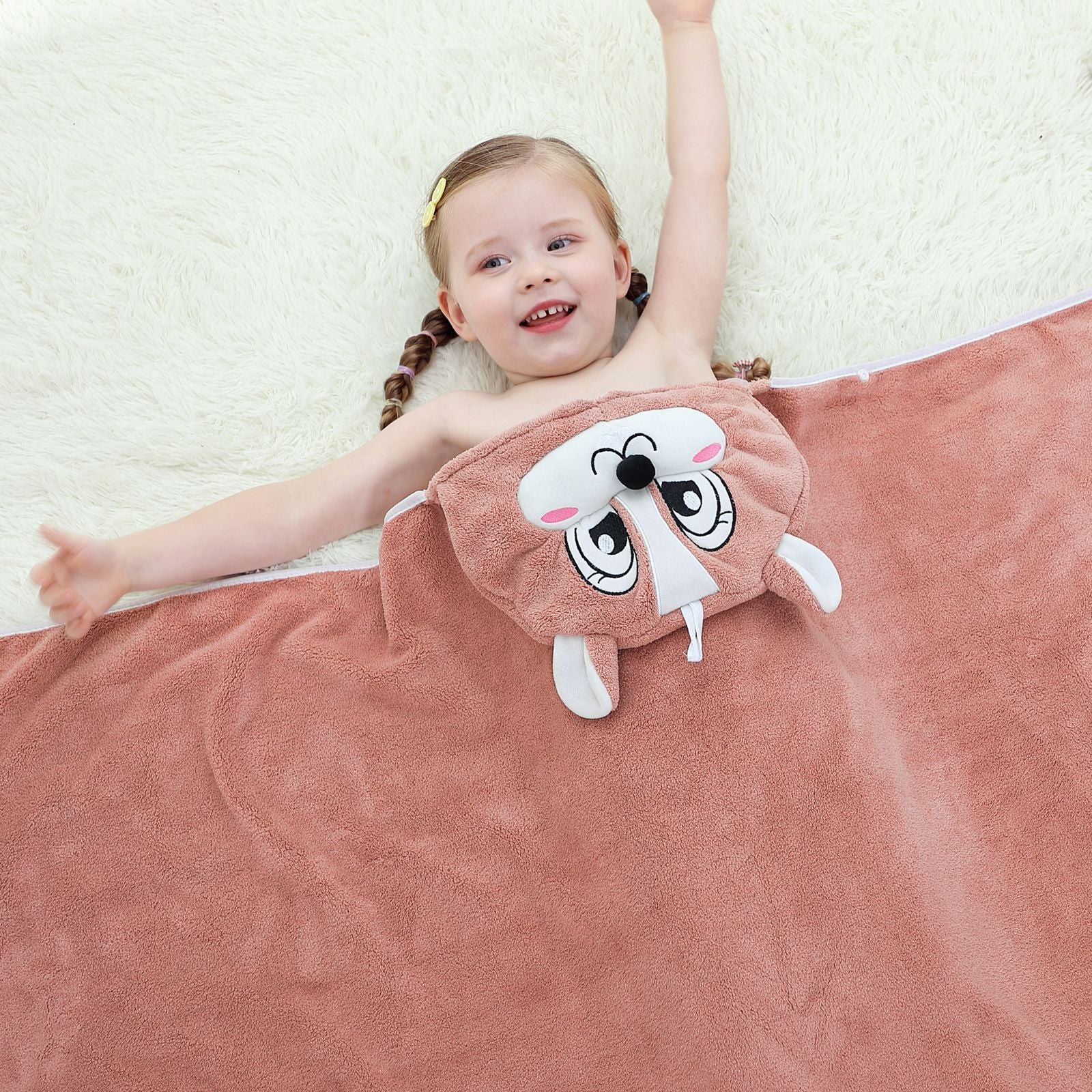 動物の耳付きフードが付いたデザインで、バスタイム後の赤ちゃんをやさしく包み込みます。