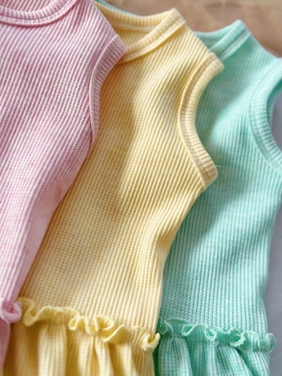 やわらかな ワッフル生地×コットン100% で、汗ばむ季節でも一日中さらっと快適。肩まわりが動かしやすい ノースリーブ で、ハイハイもお昼寝も自由に。 前開きボタン で着替えもおむつ替えもスムーズです。