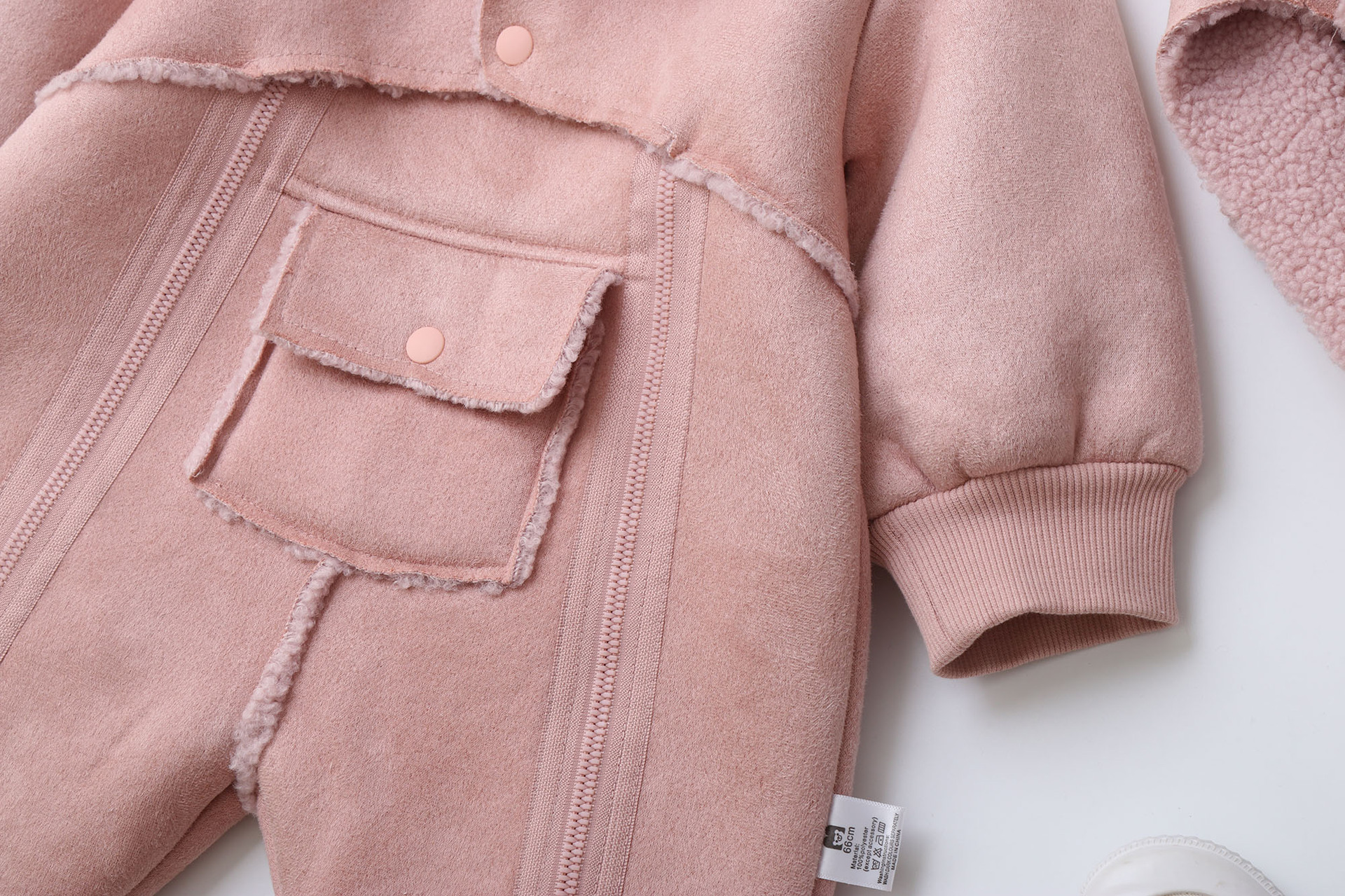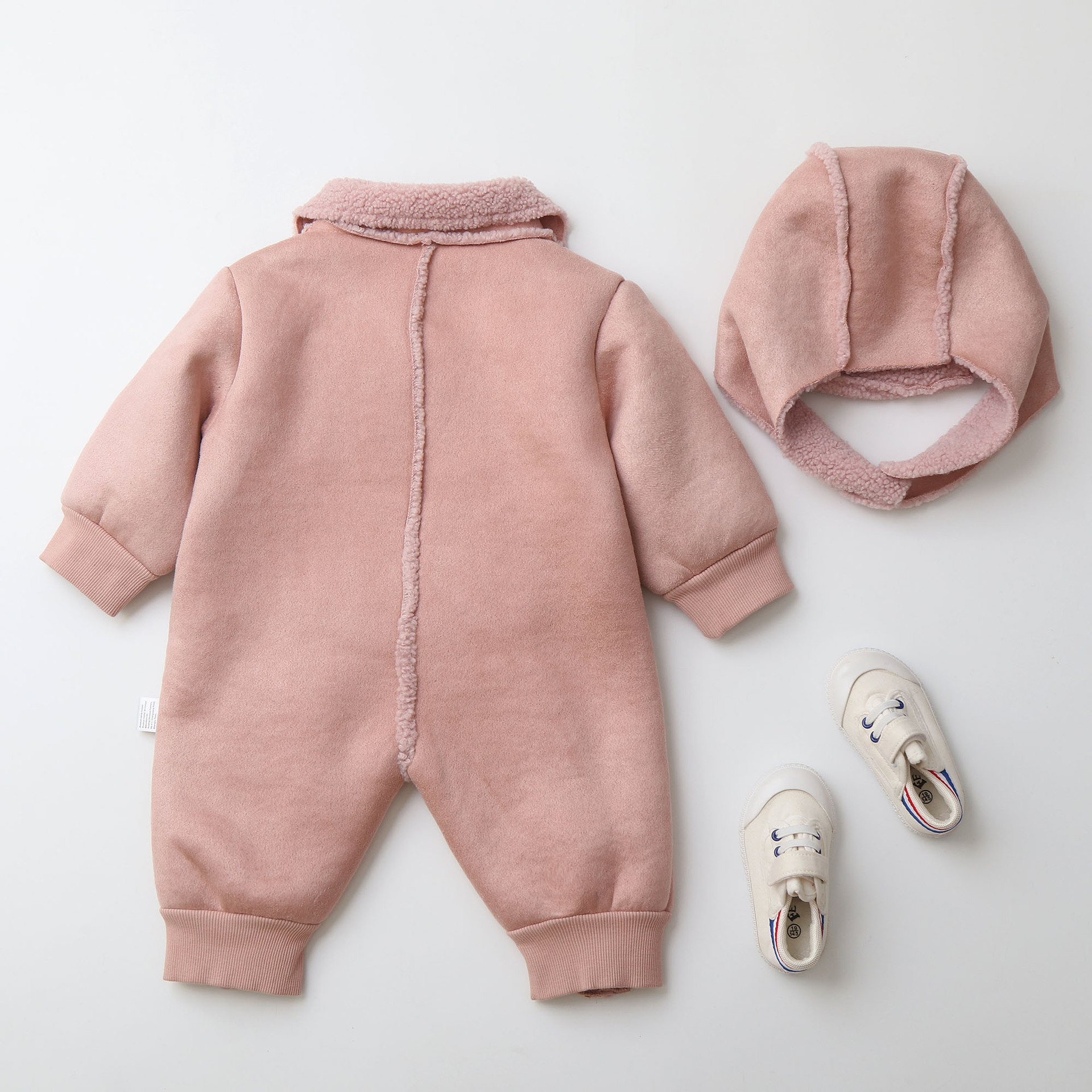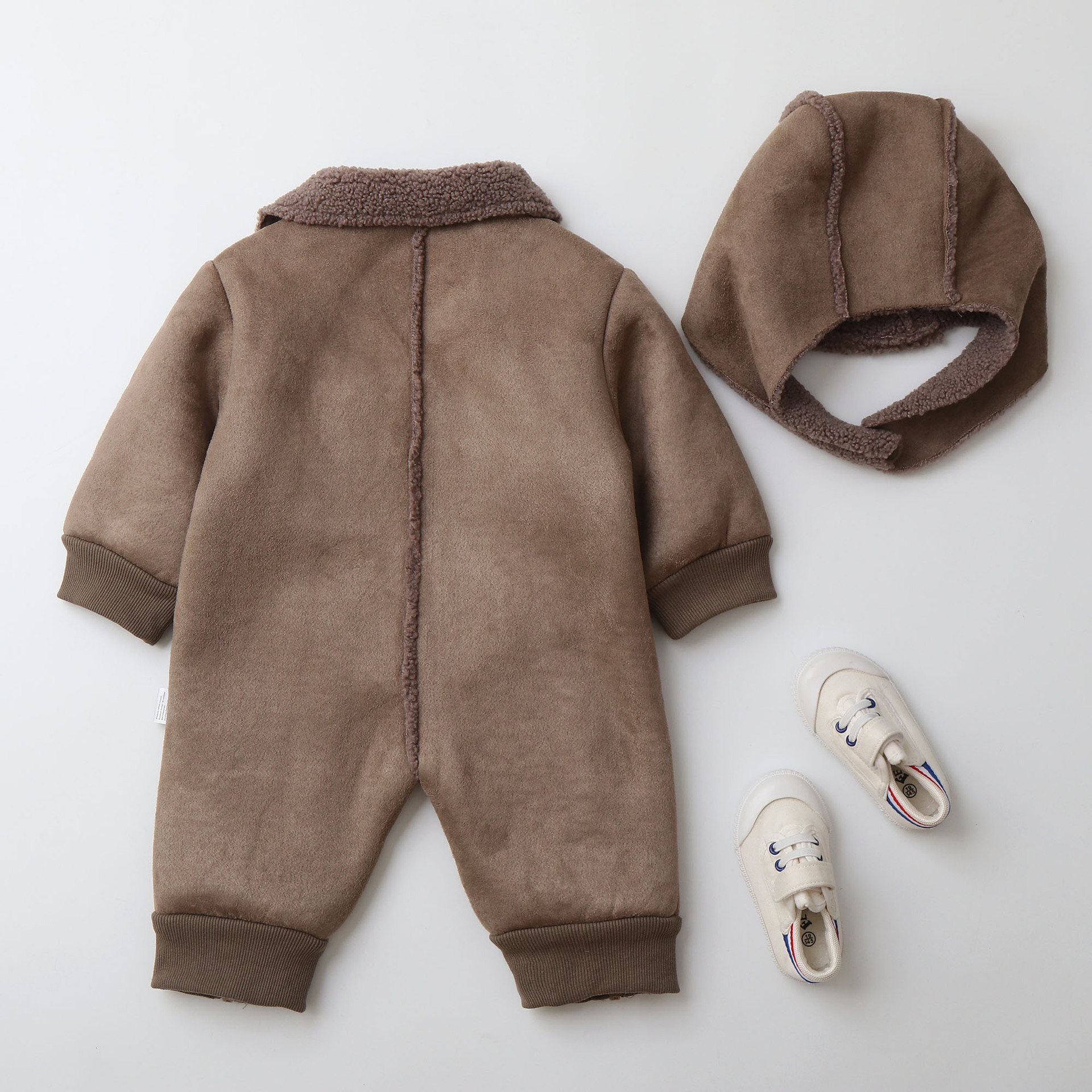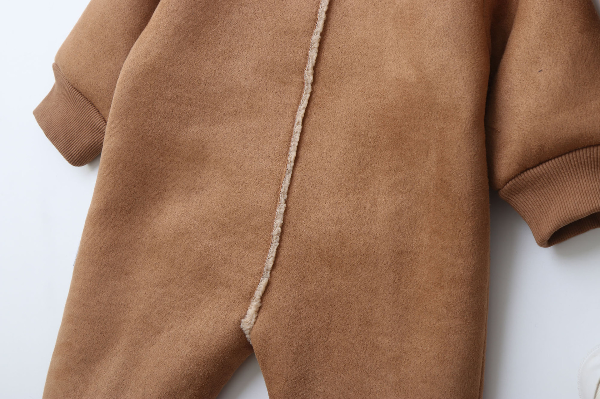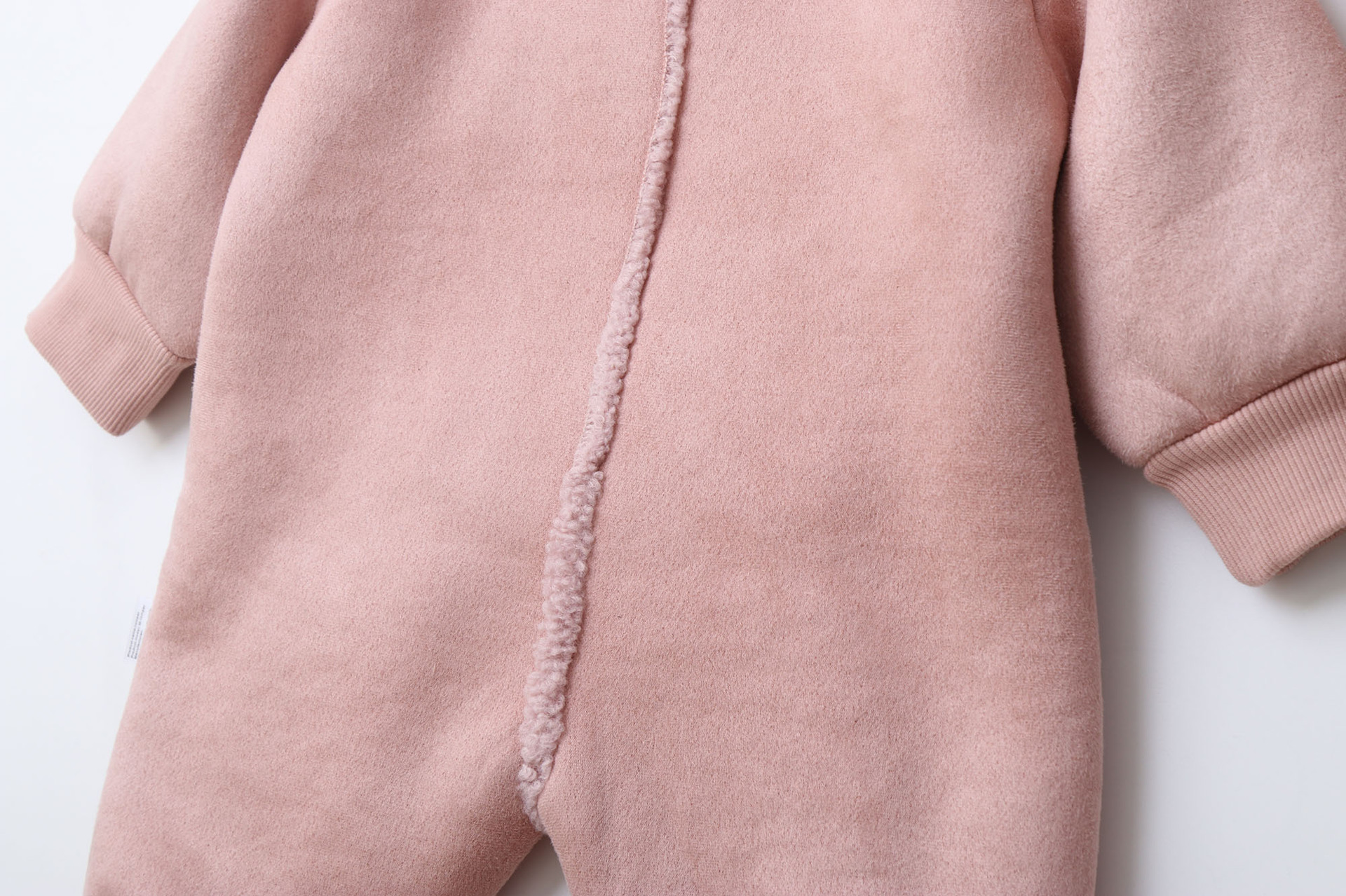寒い季節でも赤ちゃんをやさしく包み込む— 厚手ファー素材のフード付きベビーロンパース 。