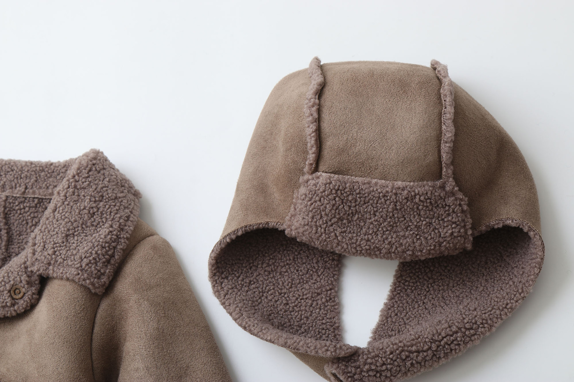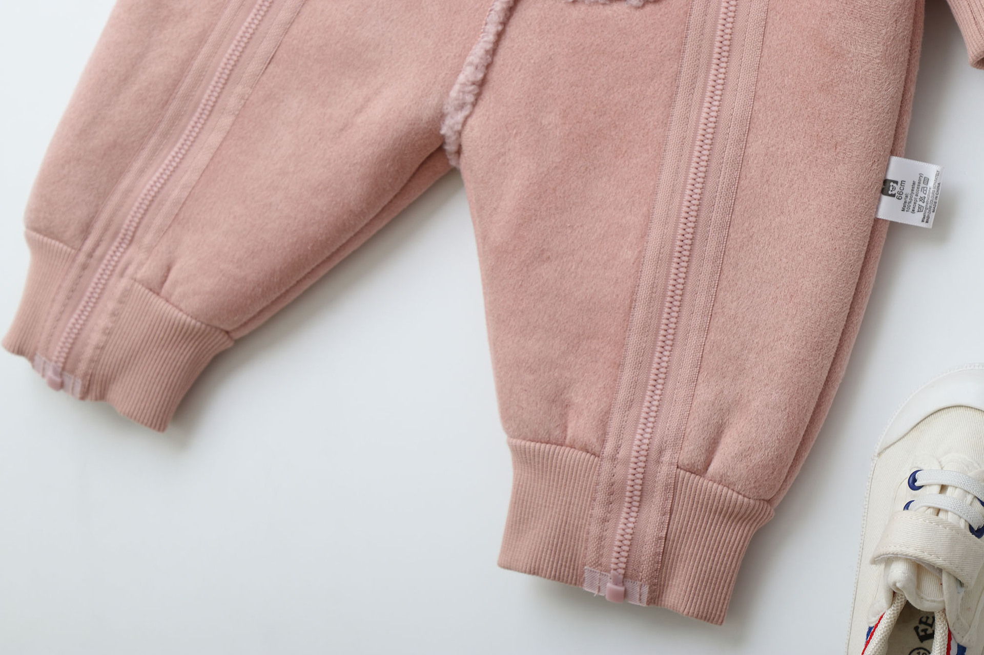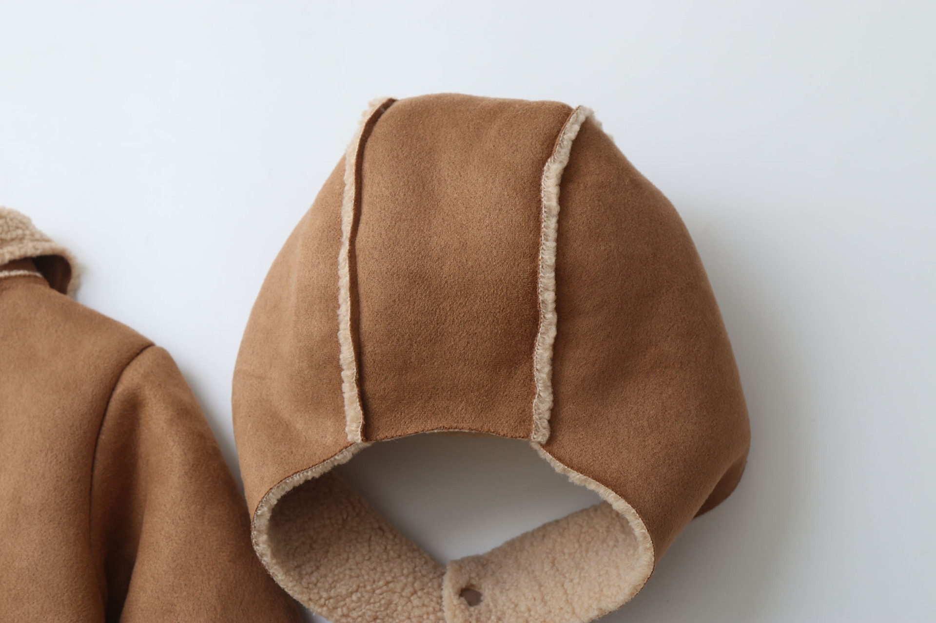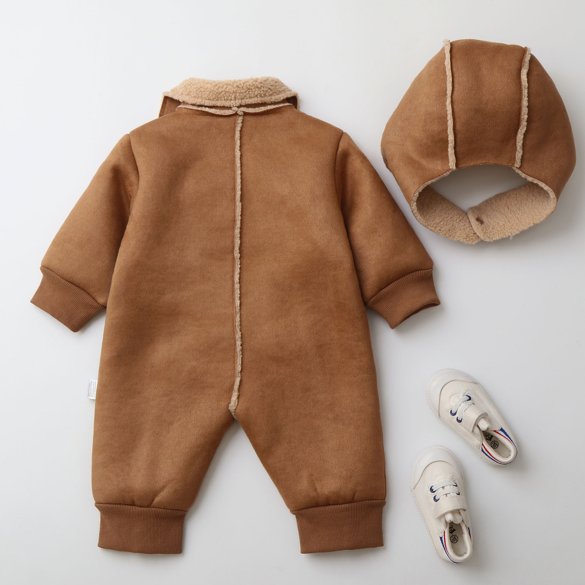 寒い季節でも赤ちゃんをやさしく包み込む— 厚手ファー素材のフード付きベビーロンパース 。