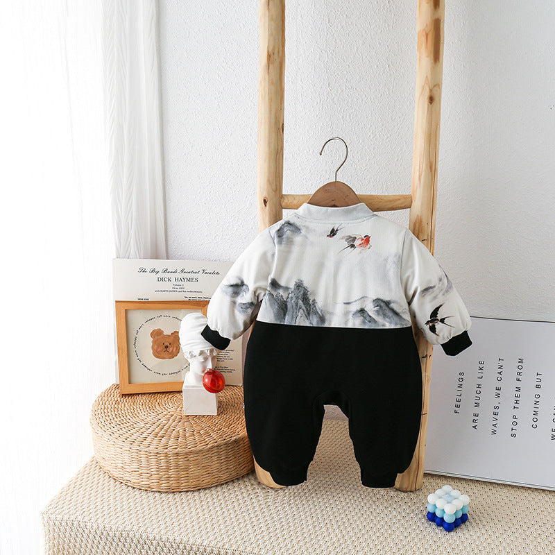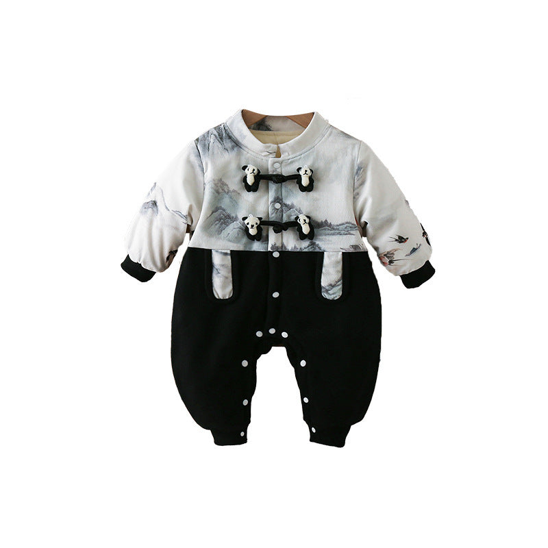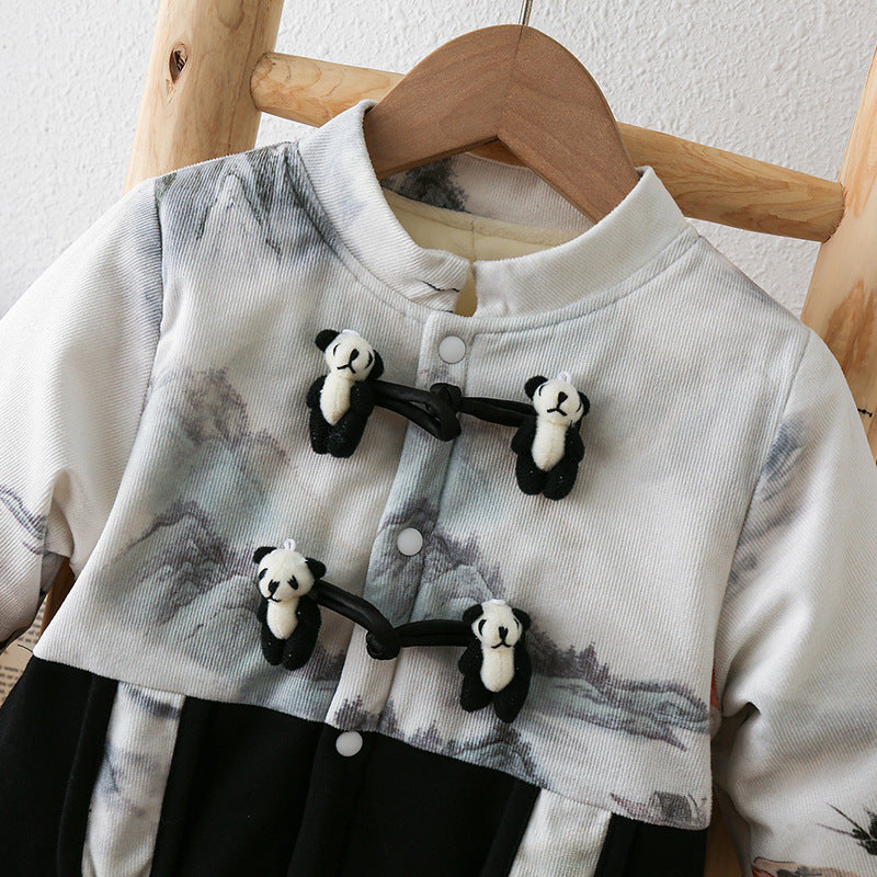 ベビー秋冬 中華テイスト カートゥーン長袖ロンパース|厚手・裏起毛・シングルブレスト・66–90cm | Baby Chinese-Style Plush Long Romper (Thickened, Single-Breasted, 66–90cm)