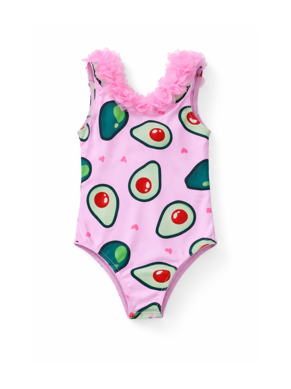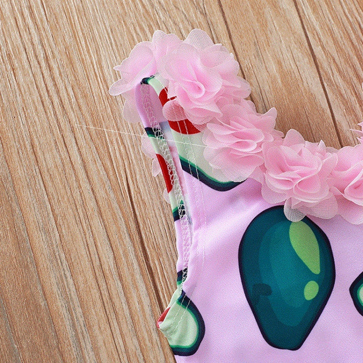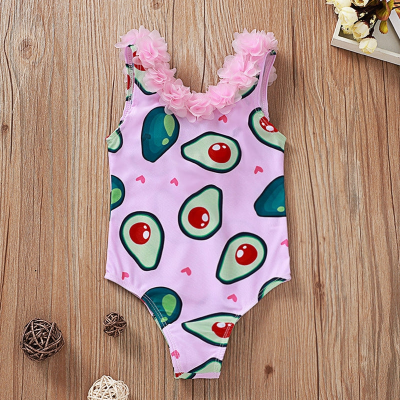 アボカド柄 ピンク キッズワンピース水着|フラワーネックデザイン・80〜120cm