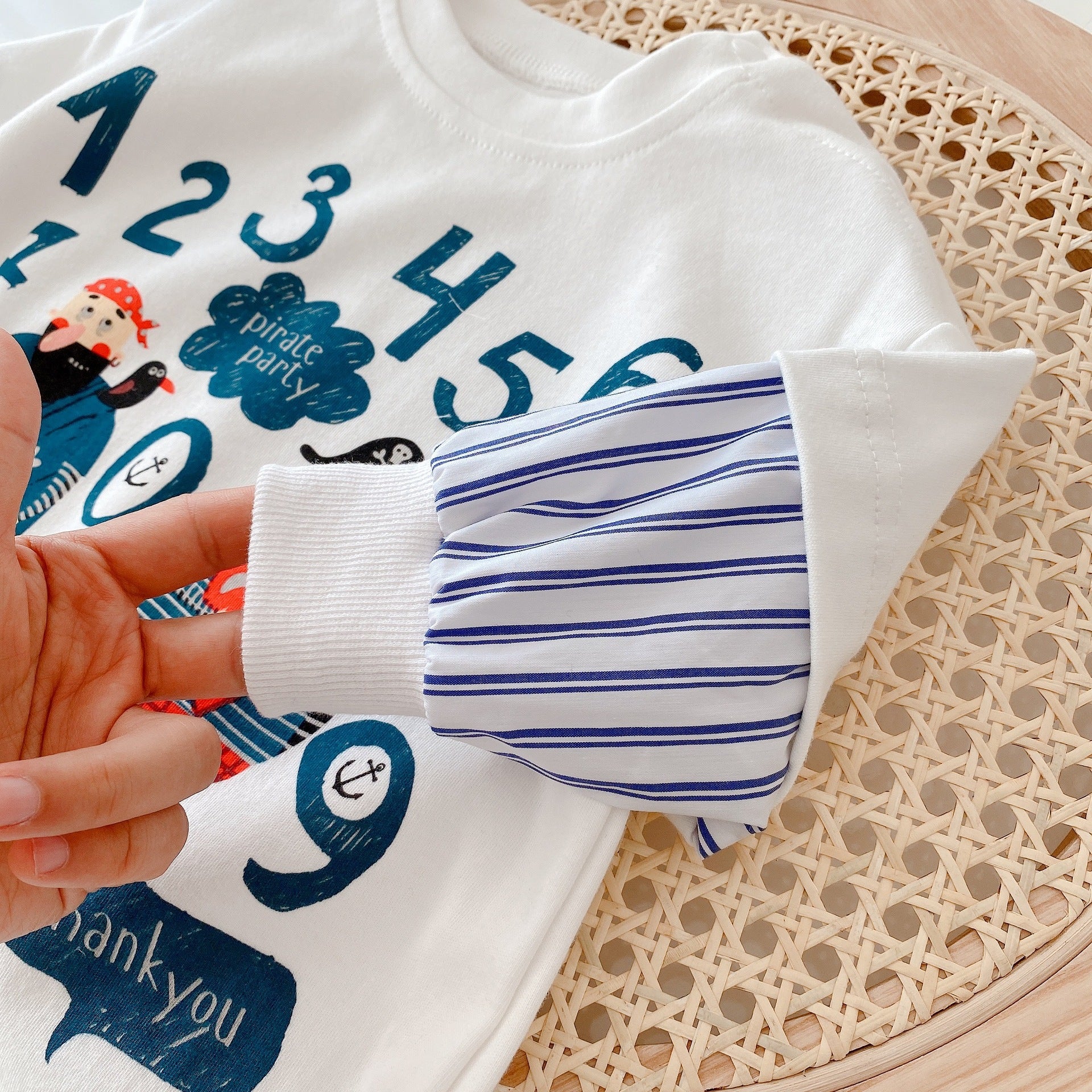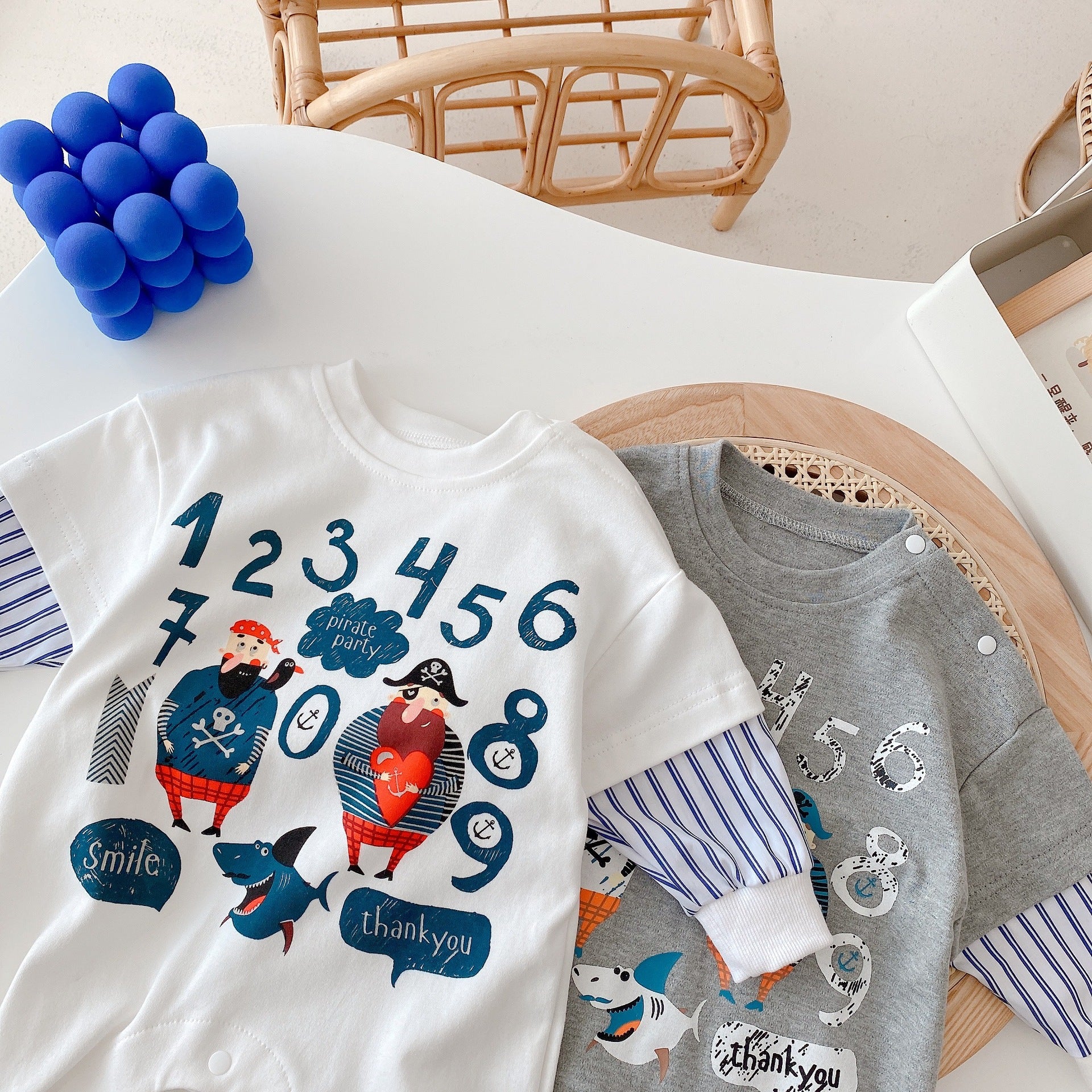 春秋のおでかけがもっと可愛くなる 男の子ベビーカバーオール 重ね着風カートゥーンプリント コットン 長袖 グレー・ホワイト 66~90