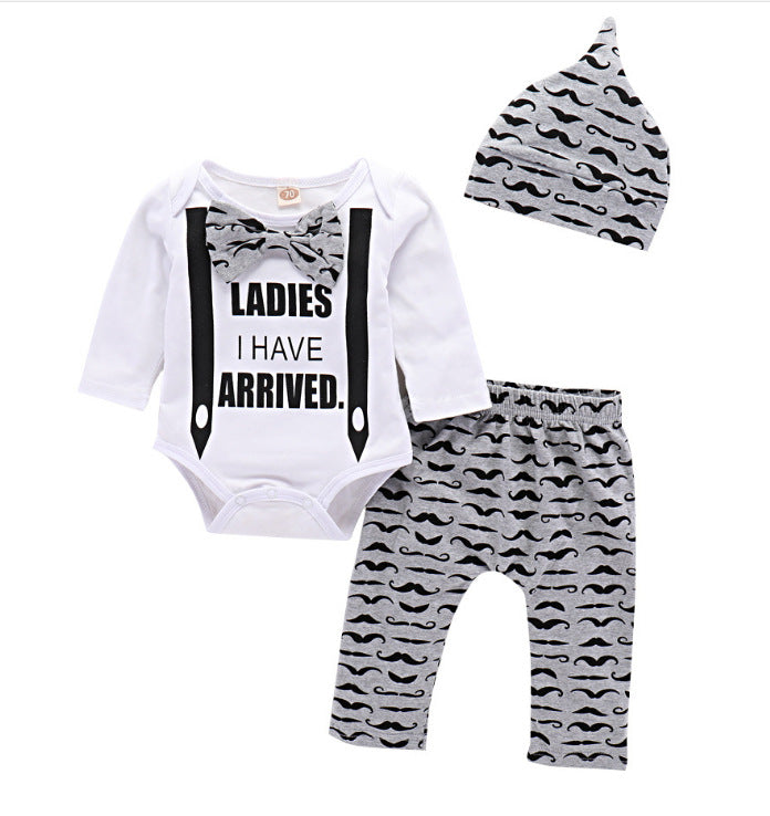 やわらかニットで秋も心地いい 男の子ベビー長袖ロンパース3点セット ひげ柄サスペンダー風プリント コットン 60~100cm