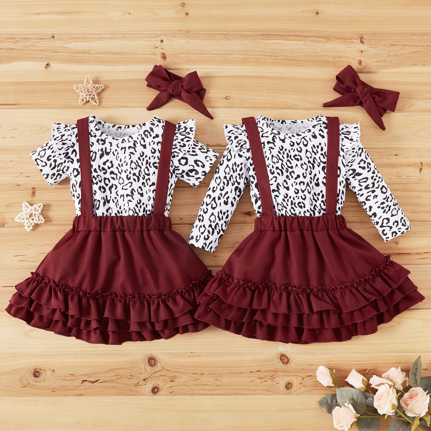 甘辛レオパードでおめかしが完成する 女の子ロンパース&ストラップスカート3点セット フリルデザイン コットン90% バーガンディ レオパード柄 70~100cm