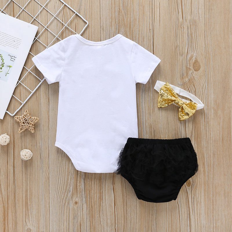 王冠モチーフのロゴプリントが目を惹くホワイトロンパースに、ブラックブルマのきらめきリボンとヘアバンドを合わせた、特別感のあるセットです。
