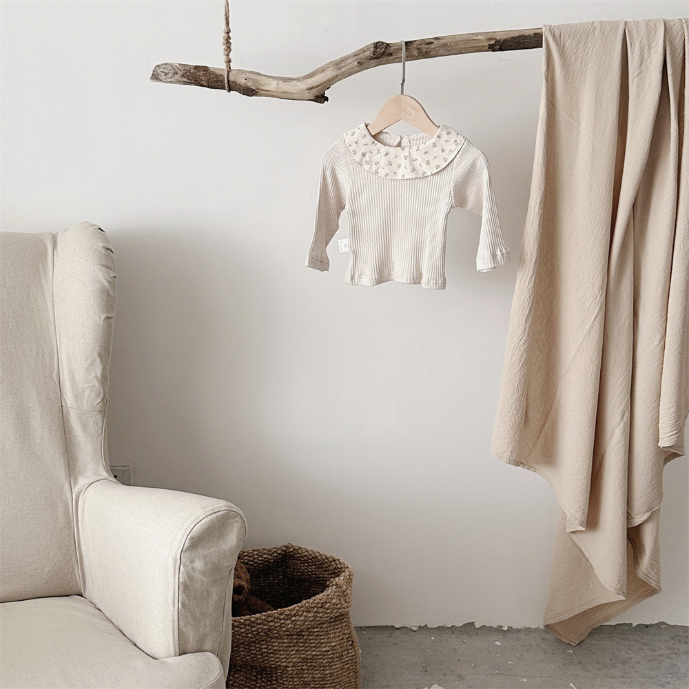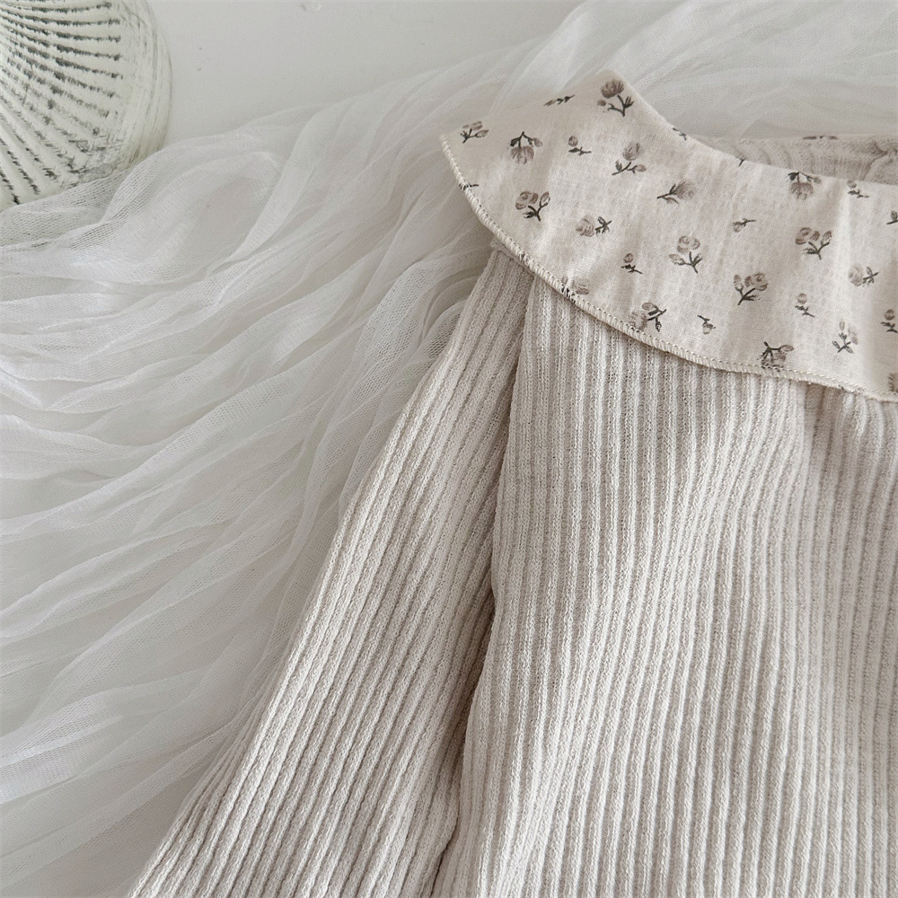 こころを包み込むやさしい着心地で、ベビーの肌にふんわり寄り添うコットンニットの長袖トップス。 首もとの花柄フリル襟がぱっと目を引き、ナチュラルカラーで着回しやすいベビー女の子花柄フリル襟トップスです。