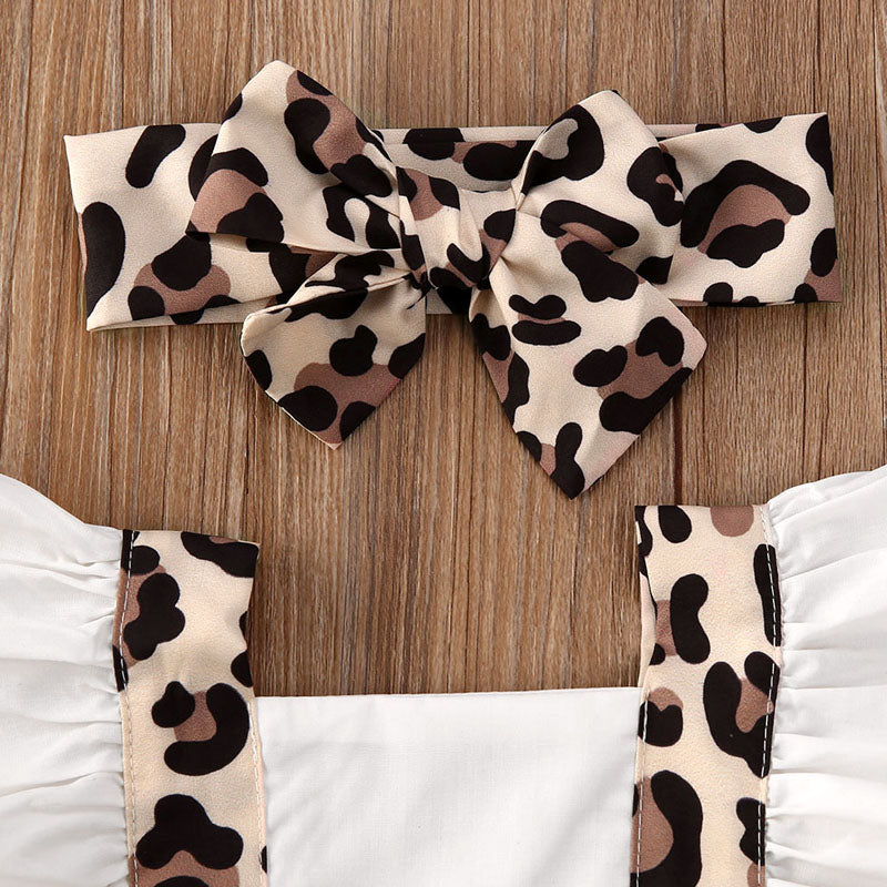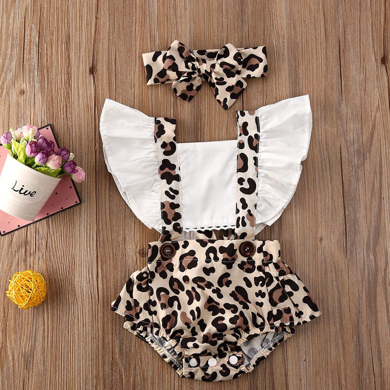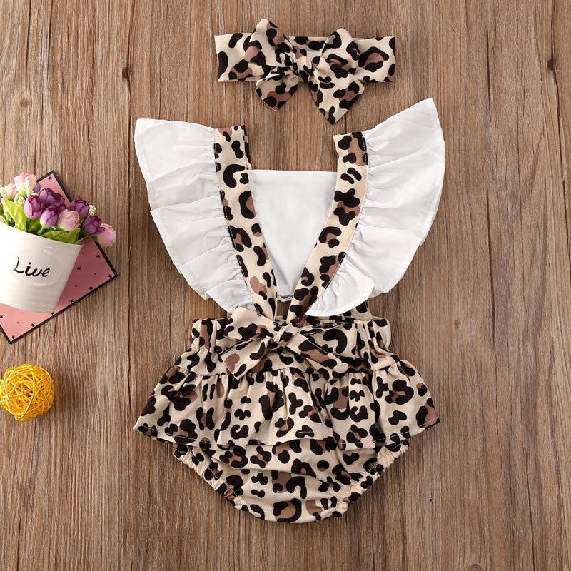 レオパード柄サスペンダー風ロンパース+ヘアバンド 2点セット 70~100cm
