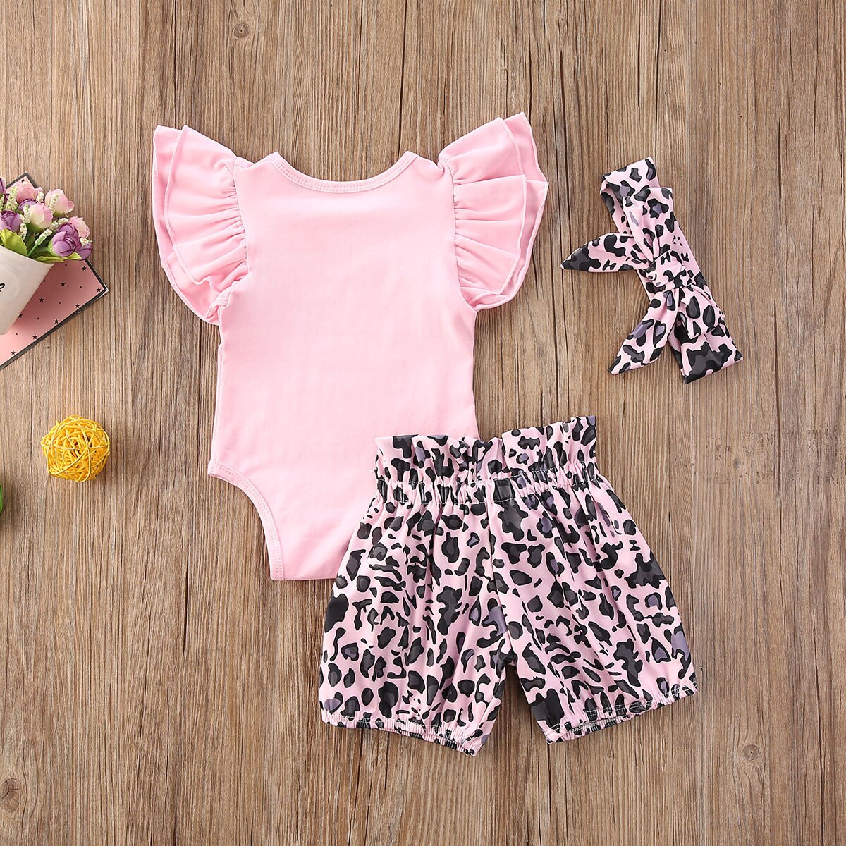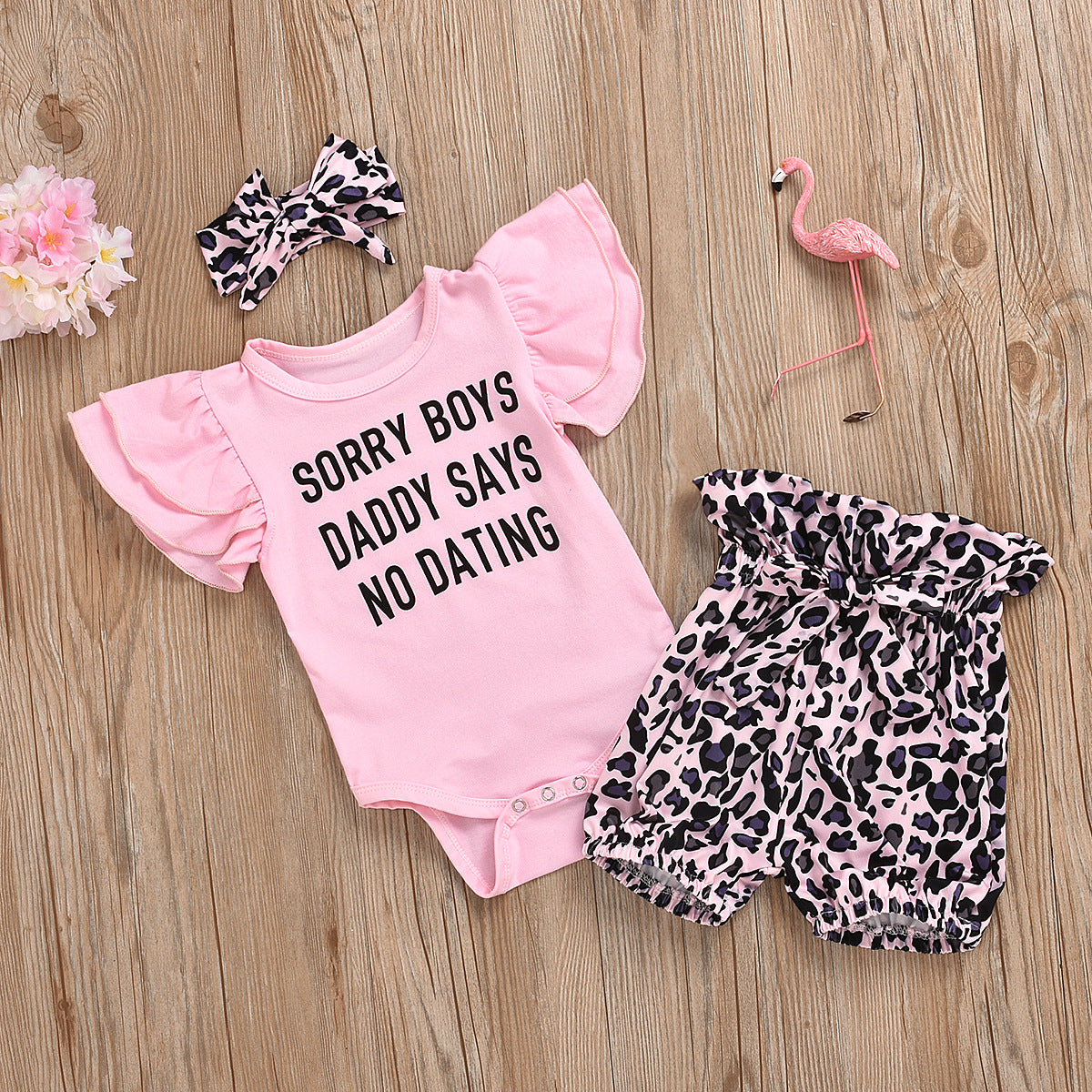 ピンク半袖ロンパース&レオパード柄パンツ 3点セット(70・80・90・100cm)