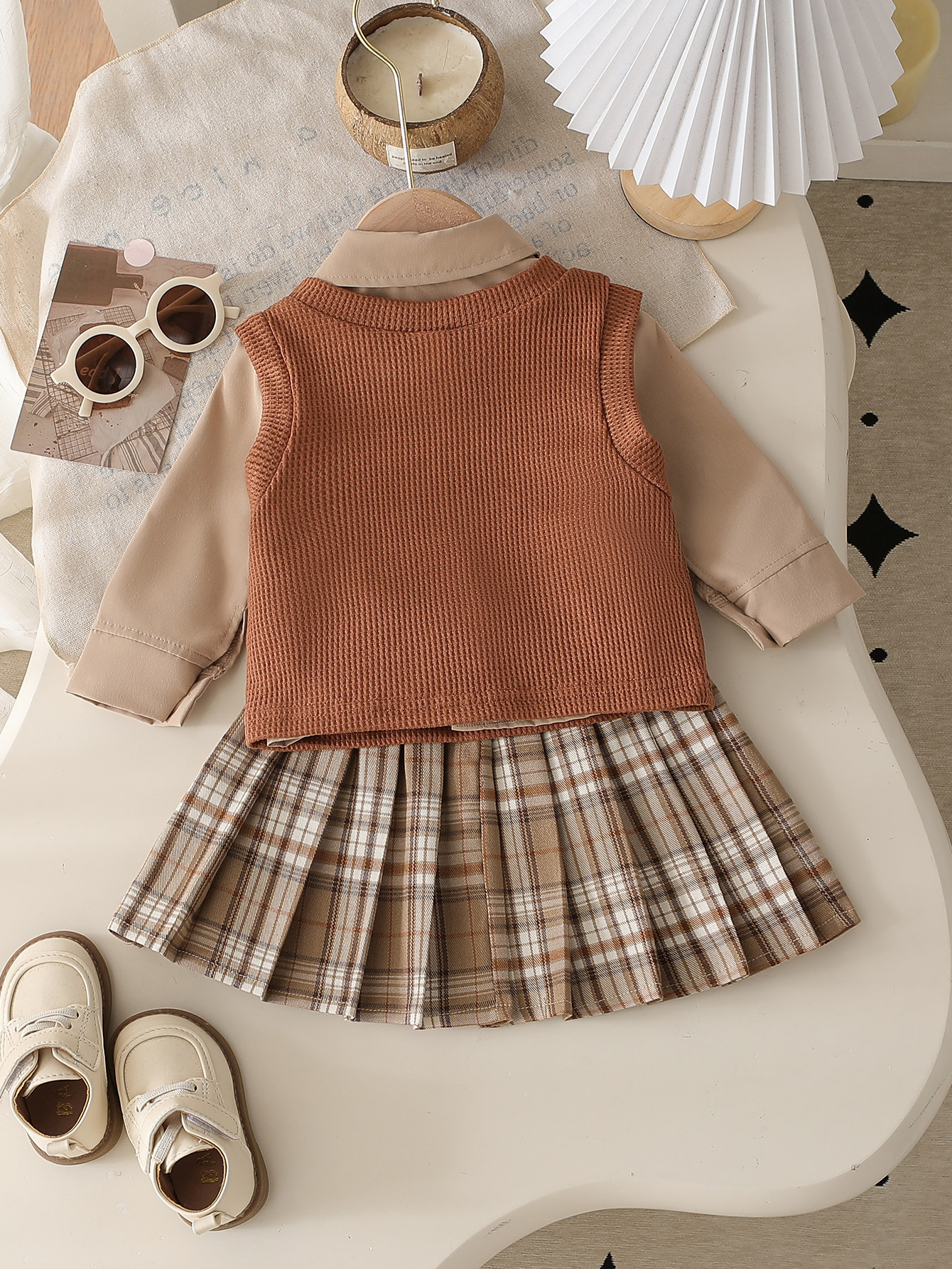 上品チェック柄スカートでおめかし 女の子ブラウス&ニットベスト3点セット 無地ライトブラウン ポリエステル 6〜9ヶ月・9〜12ヶ月・12〜24ヶ月・2〜3歳