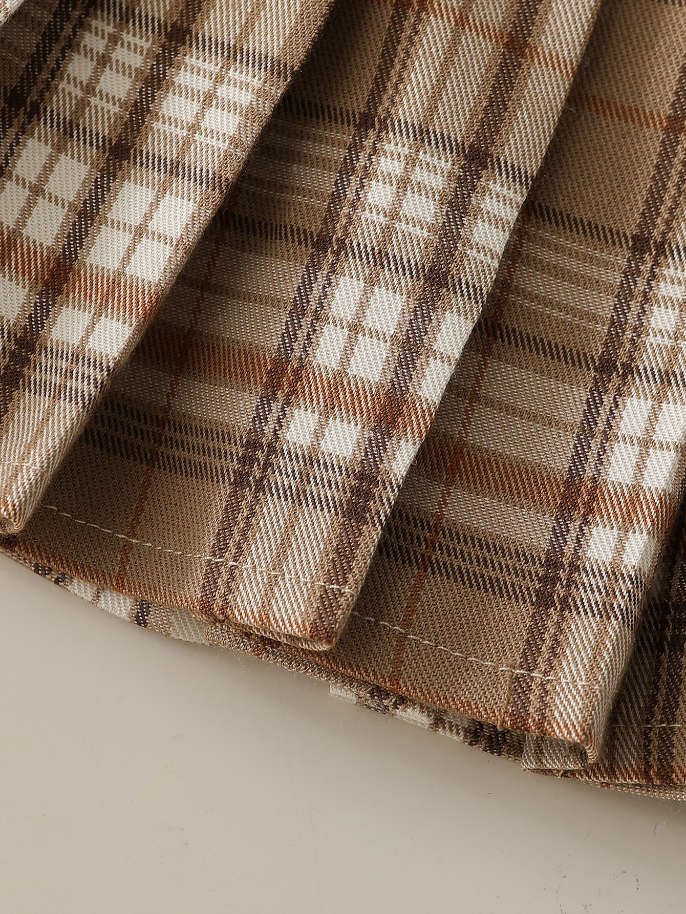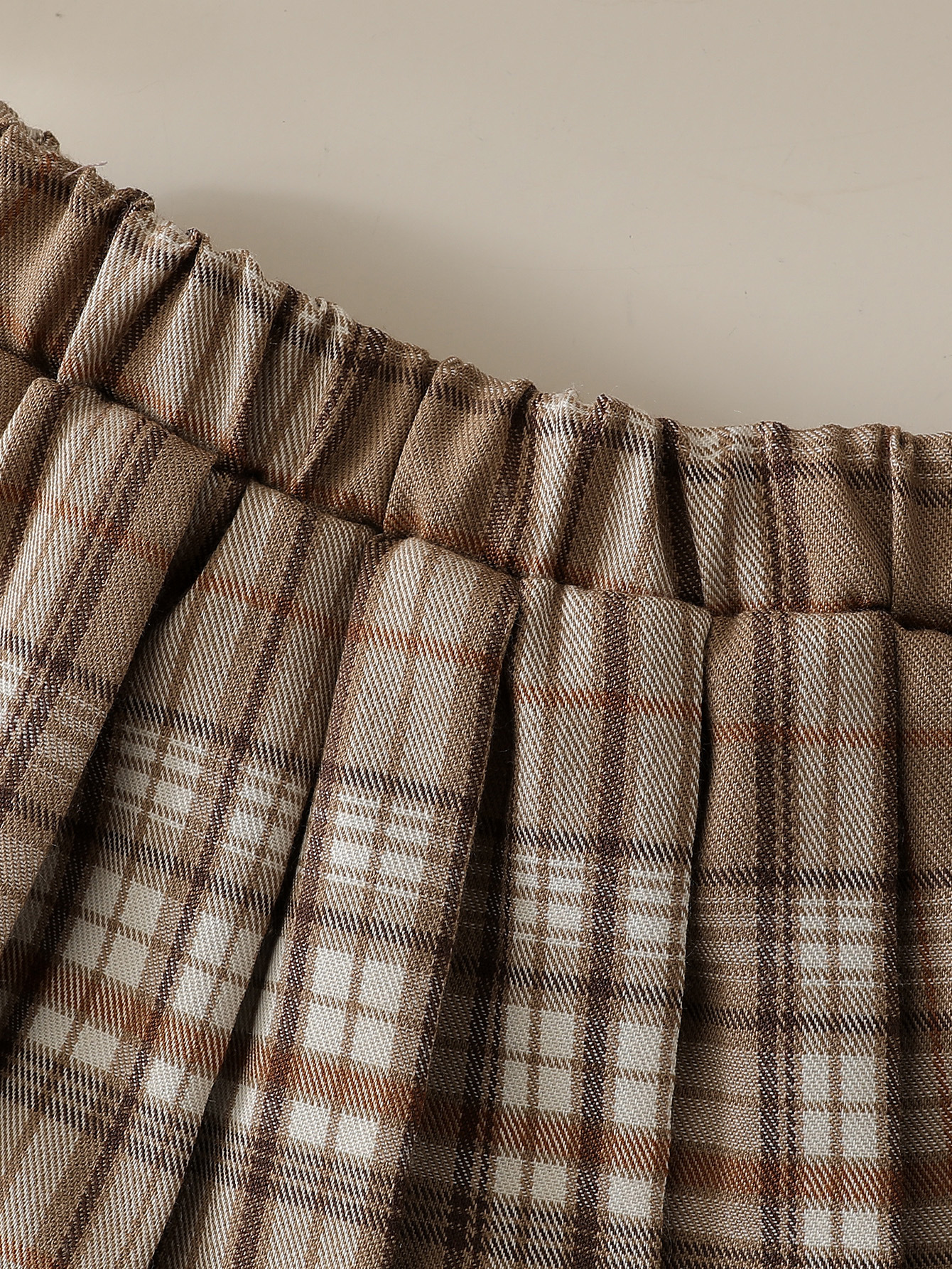 - ★ チェック柄スカート: ふんわり広がるプリーツ風シルエットで写真映えする一枚