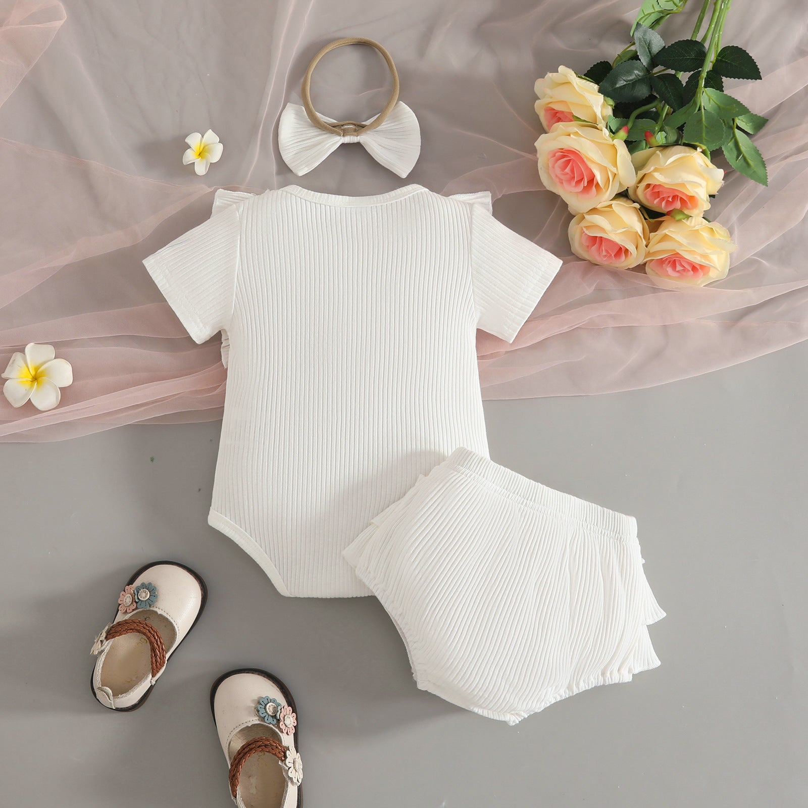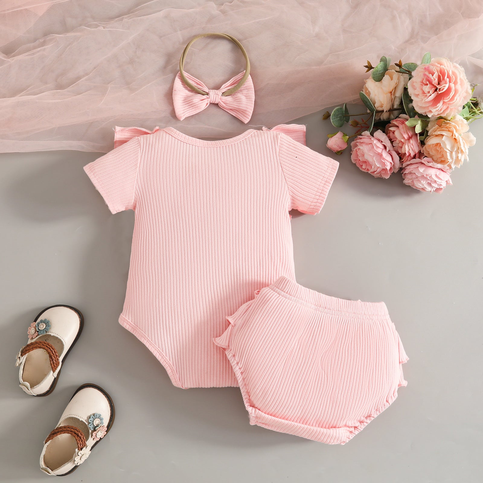 さらっとリブで夏も快適な 赤ちゃん女の子ロンパース&フリルブルマ&リボンヘアバンド3点セット 無地デザイン ポリエステルリブニット 0〜18ヶ月