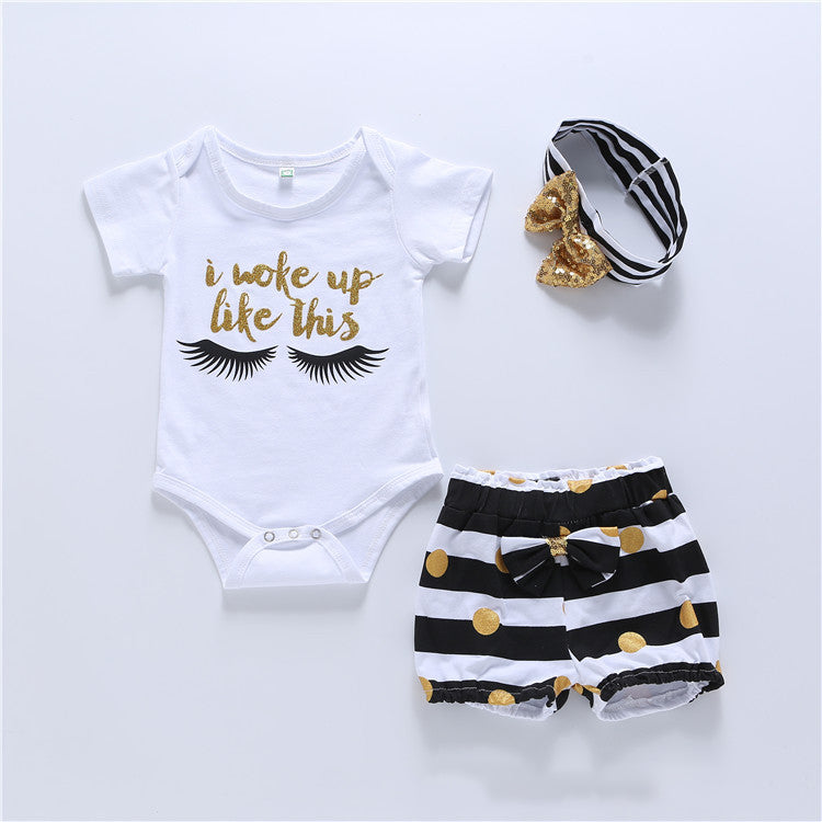 おしゃれに映えて夏の気分が上がる 女の子半袖ロンパース&ボーダーショートパンツ&ターバン3点セット コットン ホワイト 70~110cm