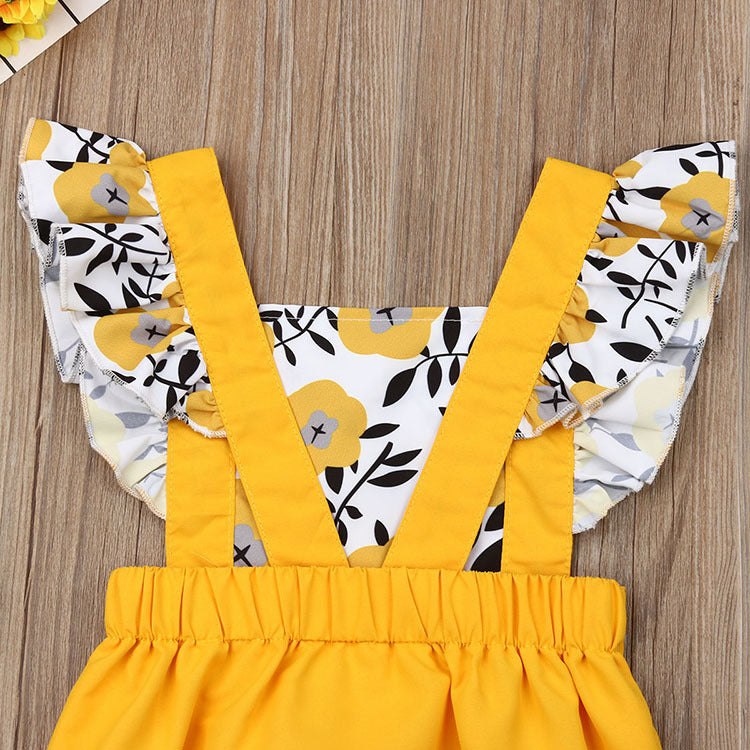 花柄トップスが可愛い フリル袖ロンパース イエロー 73~100cm