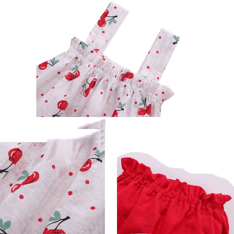 ふんわり可愛いおめかしが完成する 女の子ベビーサスペンダースカート上下セット チェリー柄・リーフ柄 コットン ノースリーブ 66~90cm