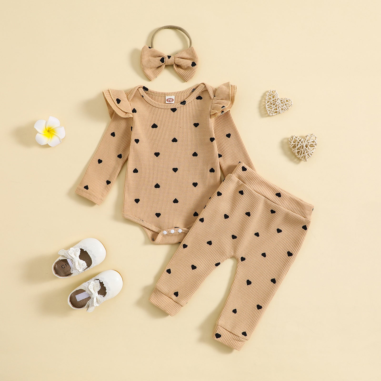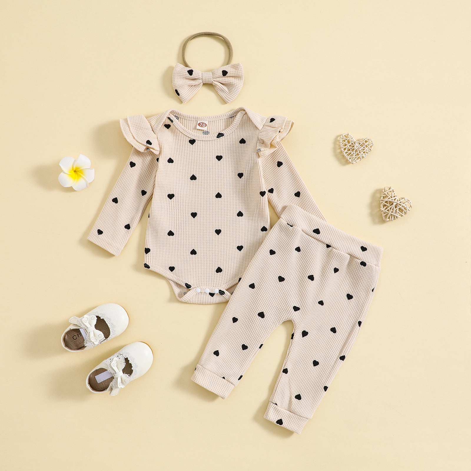 毎日がもっと可愛くなる 女の子ワッフルロンパース上下3点セット ハートプリント コットン 長袖 春秋冬 60~100cm
