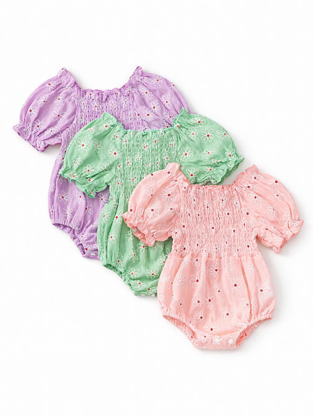 ふんわり小花とおひさまプリントが愛らしい 女の子パフ袖スカート付きロンパース コットン 切り替えデザイン 70–100cm