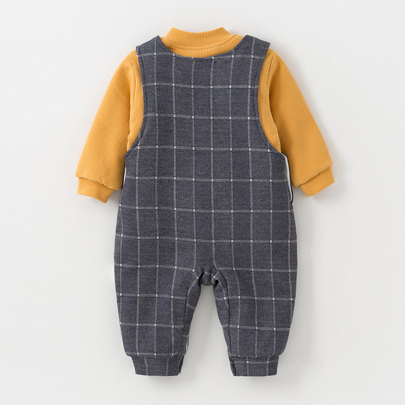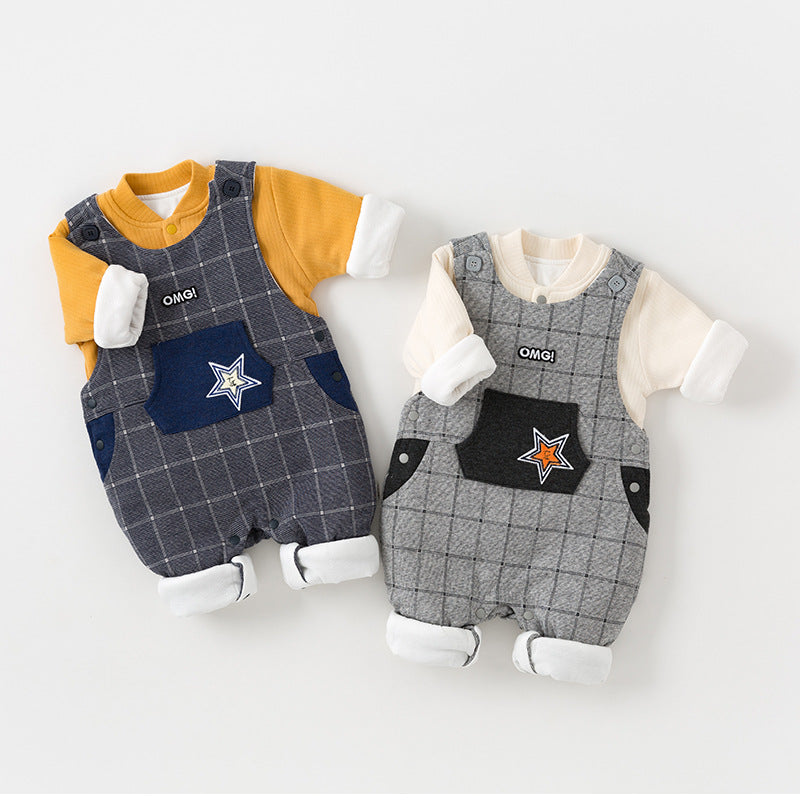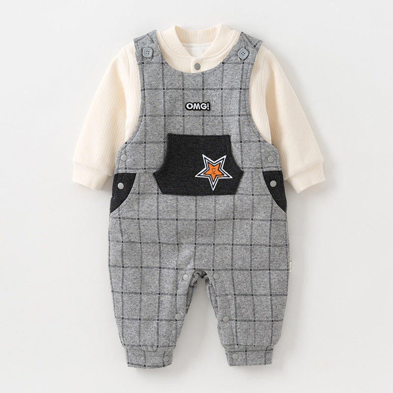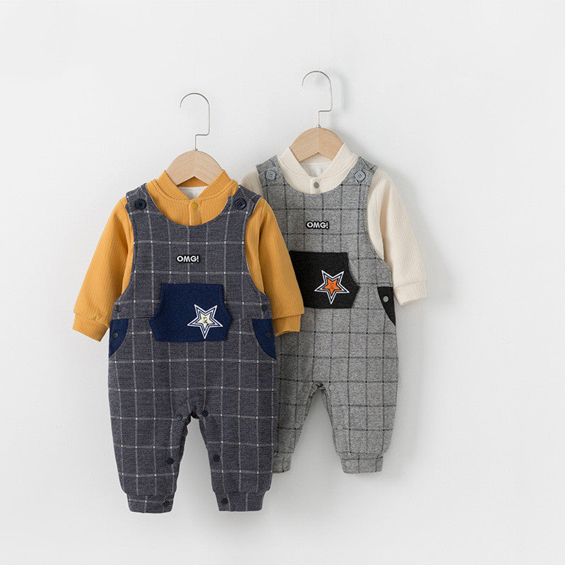 きちんと可愛いおでかけが完成する 男の子ベビー上下セット チェック柄サロペット 星ワッペン コットン95% 66~90cm