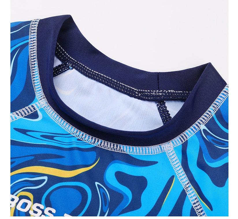 ブルーグラフィック半袖ラッシュガード上下セットは、男の子のプールや海、温泉時間を軽やかに彩るセパレート水着です。