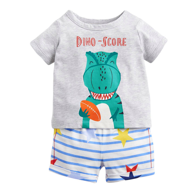 元気に遊べて夏コーデが即完成する 男の子半袖Tシャツ&ショートパンツ上下セット 恐竜カートゥーンプリント ニットコットン グレー 90~140cm