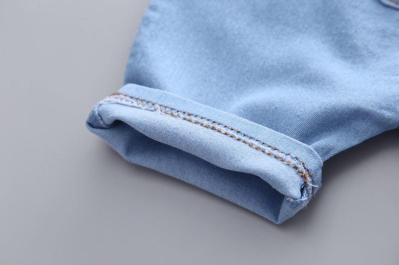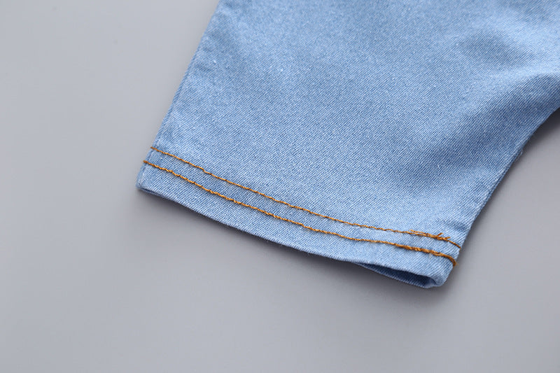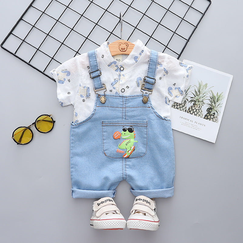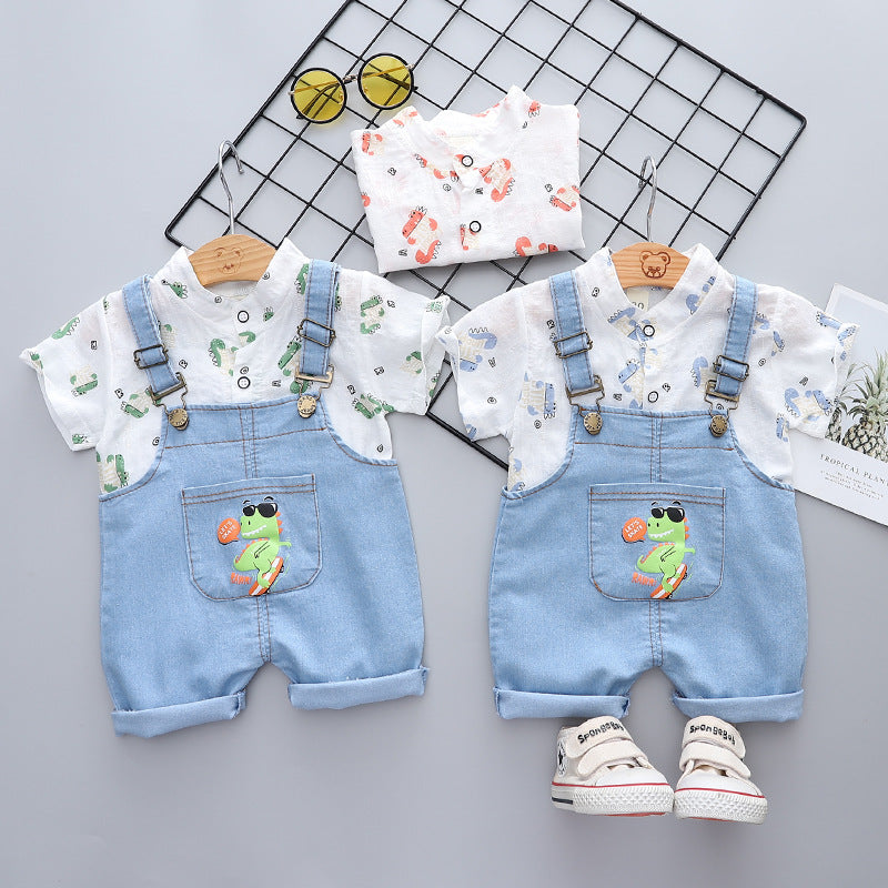 夏のおでかけがきちんと可愛く決まる 男の子半袖シャツ&デニムサロペットショーツ上下セット 恐竜プリント コットン 80~110cm