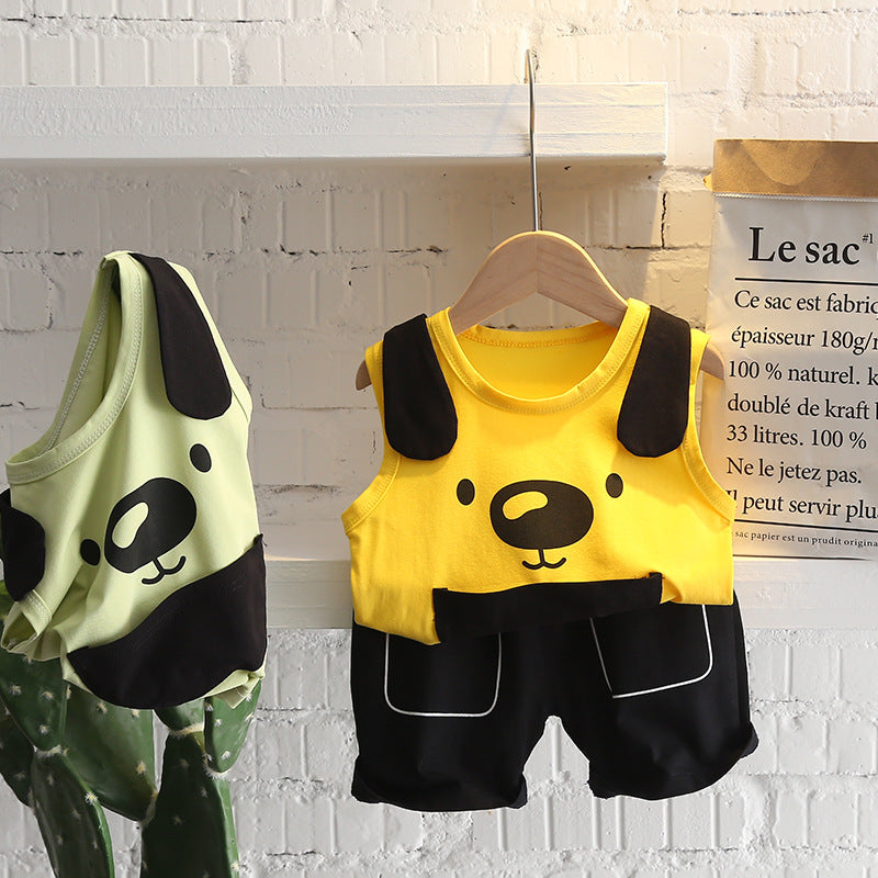 夏の外遊びがもっと快適になる 男の子カジュアル上下2点セット 犬フェイスプリント ラウンドネックノースリーブトップス+ショートパンツ コットン 80~120cm