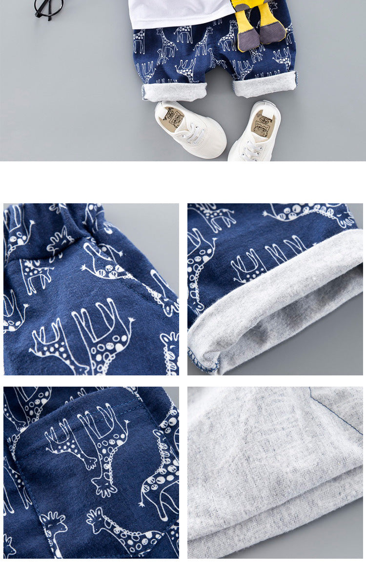 元気に動けて写真映えも叶う 男の子半袖Tシャツ上下セット キリンカートゥーンアップリケ コットン 80〜110cm