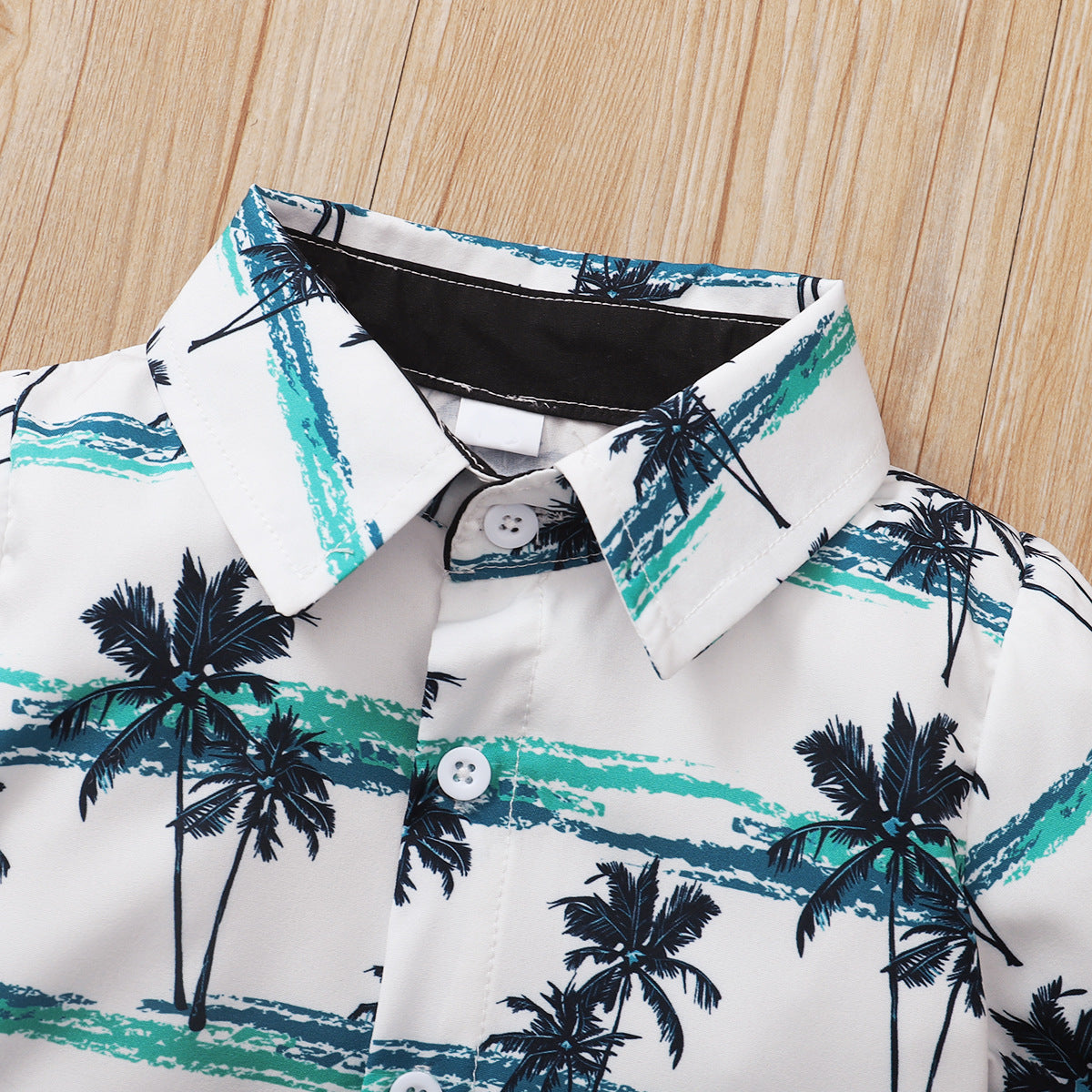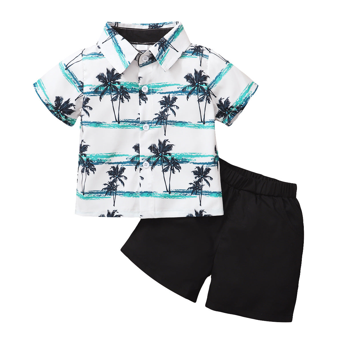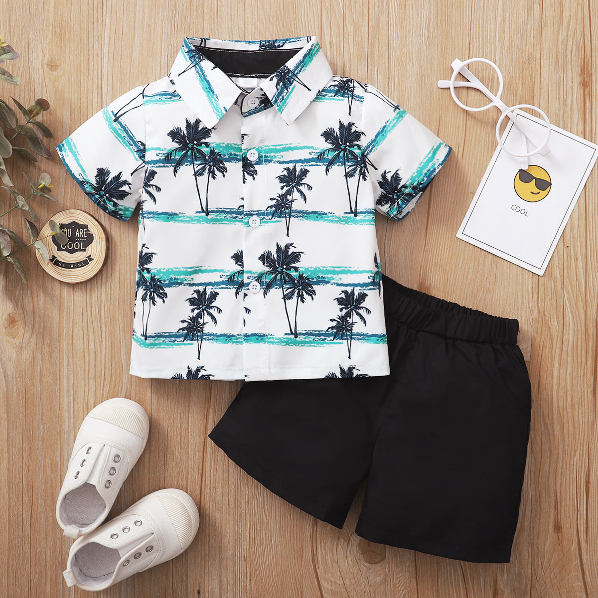 夏のお出かけが一気に爽やかに決まる 男の子ハワイアン半袖シャツ&ショートパンツセット ヤシの木プリント コットン ライトブルー 18〜24ヶ月〜4〜5歳