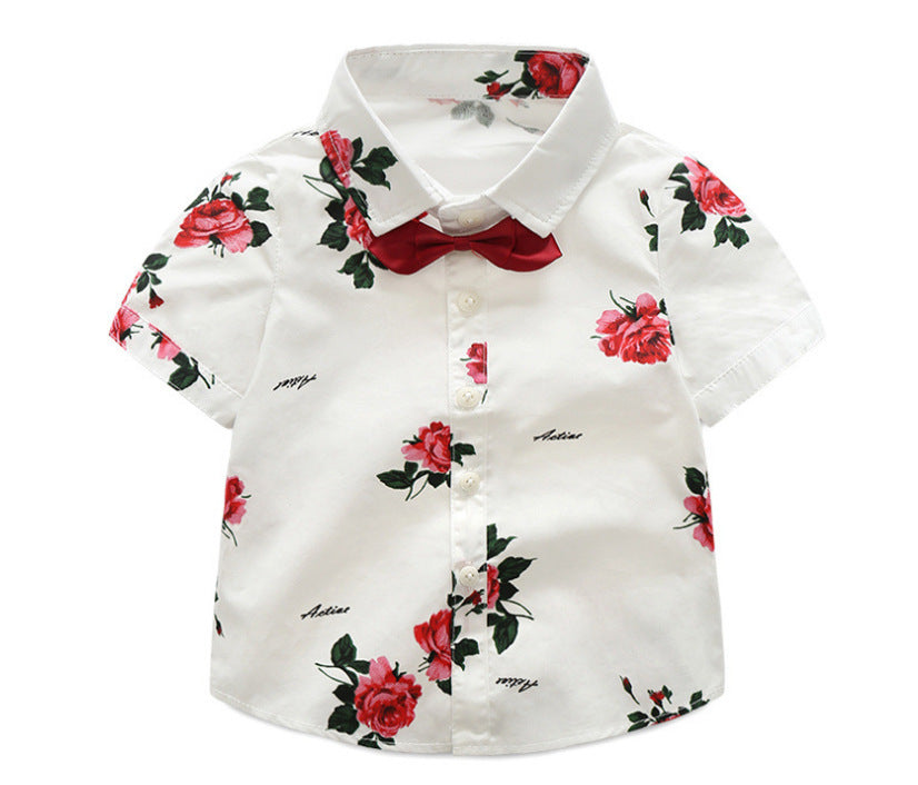 きちんと華やぐ 男の子フォーマル風セットアップ 薔薇花柄半袖シャツ&赤ショートパンツ 蝶ネクタイ付き コットン100% 90~140cm