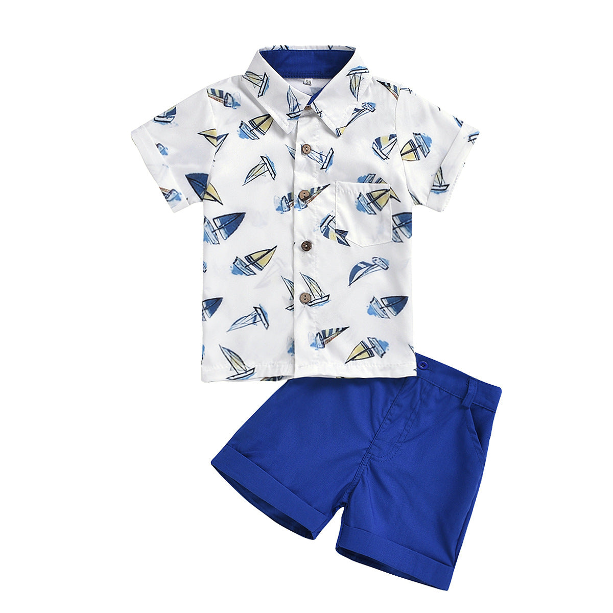 夏のおでかけがきちんと決まる 男の子半袖シャツ&ショートパンツ上下セット セーリングヨット柄プリント サファイアブルー 90~130cm