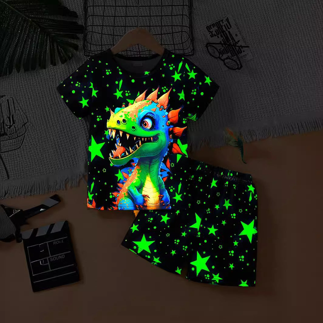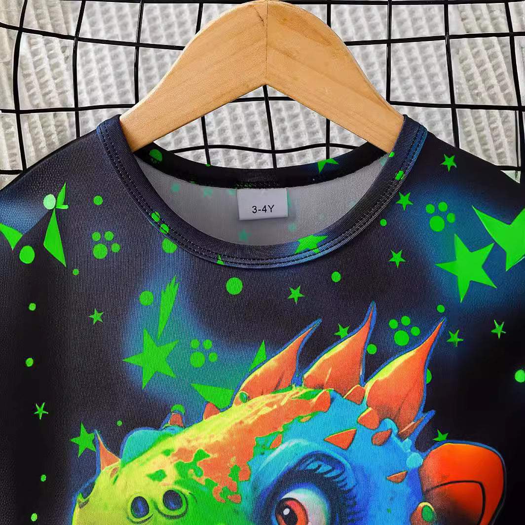 さらっと涼しい夏の毎日に 男の子半袖ルームウェア上下セット 恐竜カートゥーン&星柄 ネオン風プリント ポリエステル薄手 2〜7歳