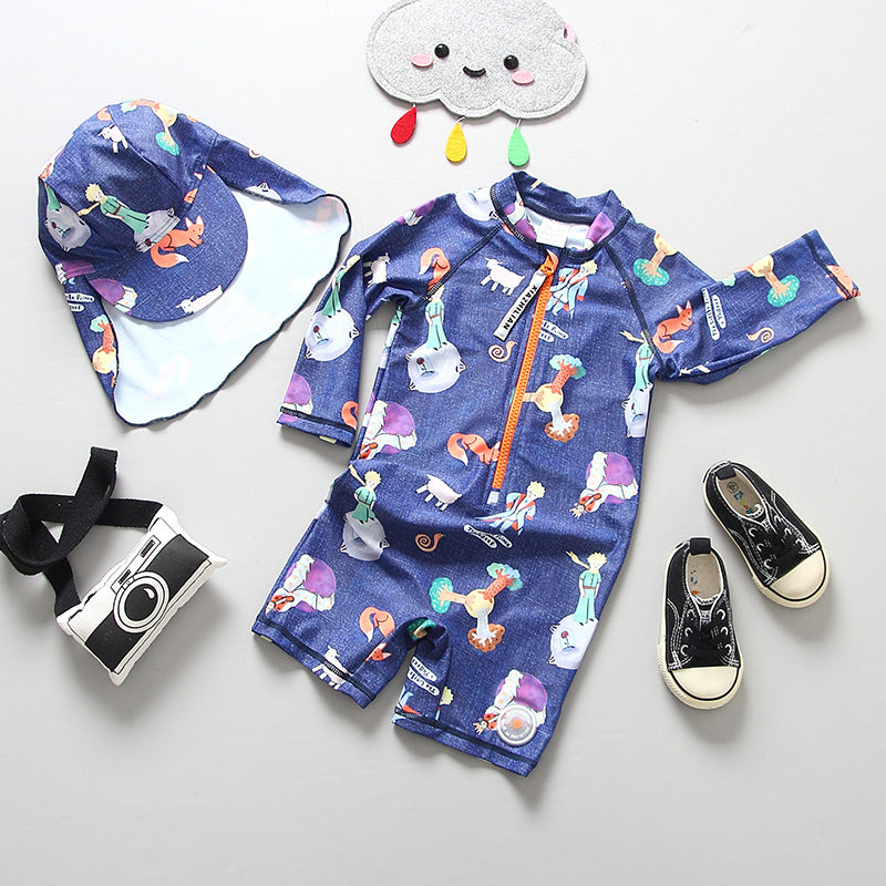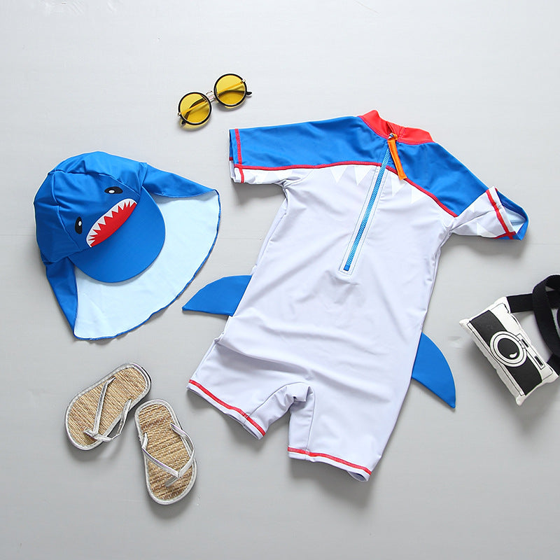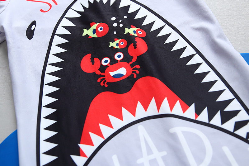 ☀ 水あそびが待ち遠しくなる、フード付きシャーク柄ボーイズUVサーフスーツ。