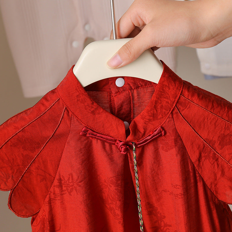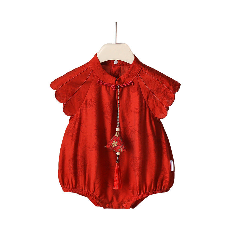 軽やかチャイナ風が映える ベビー三角ロンパース レッド・アプリコット タッセル付き レーヨン 66~90cm