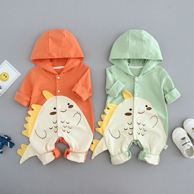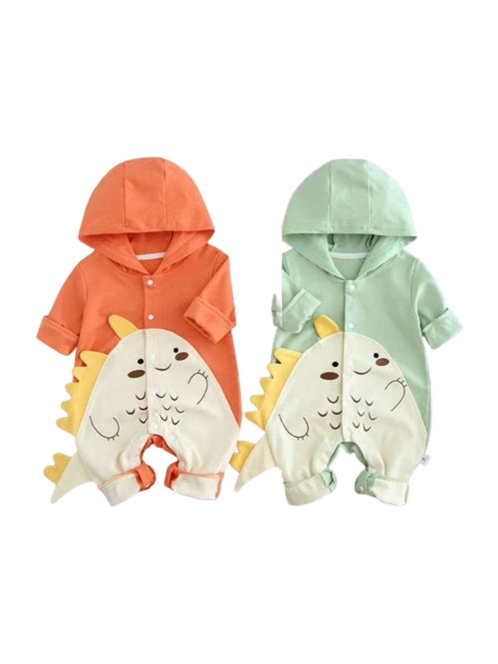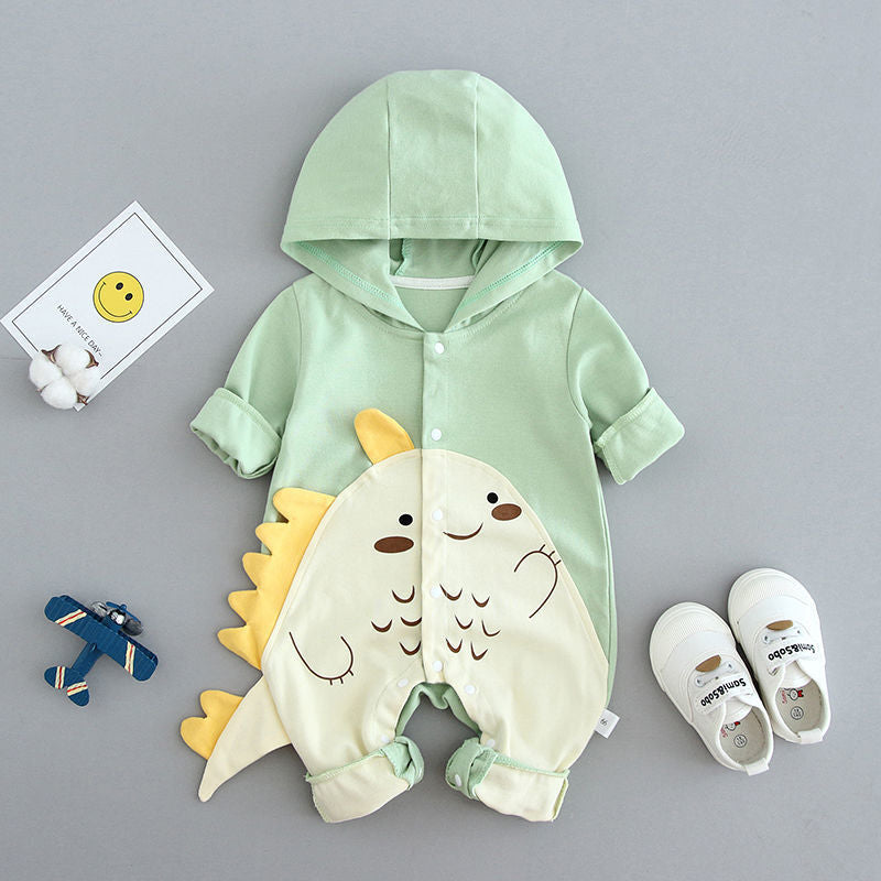 恐竜フード付きのコットンロンパースで、毎日のベビーコーデをかわいく快適に仕上げましょう。