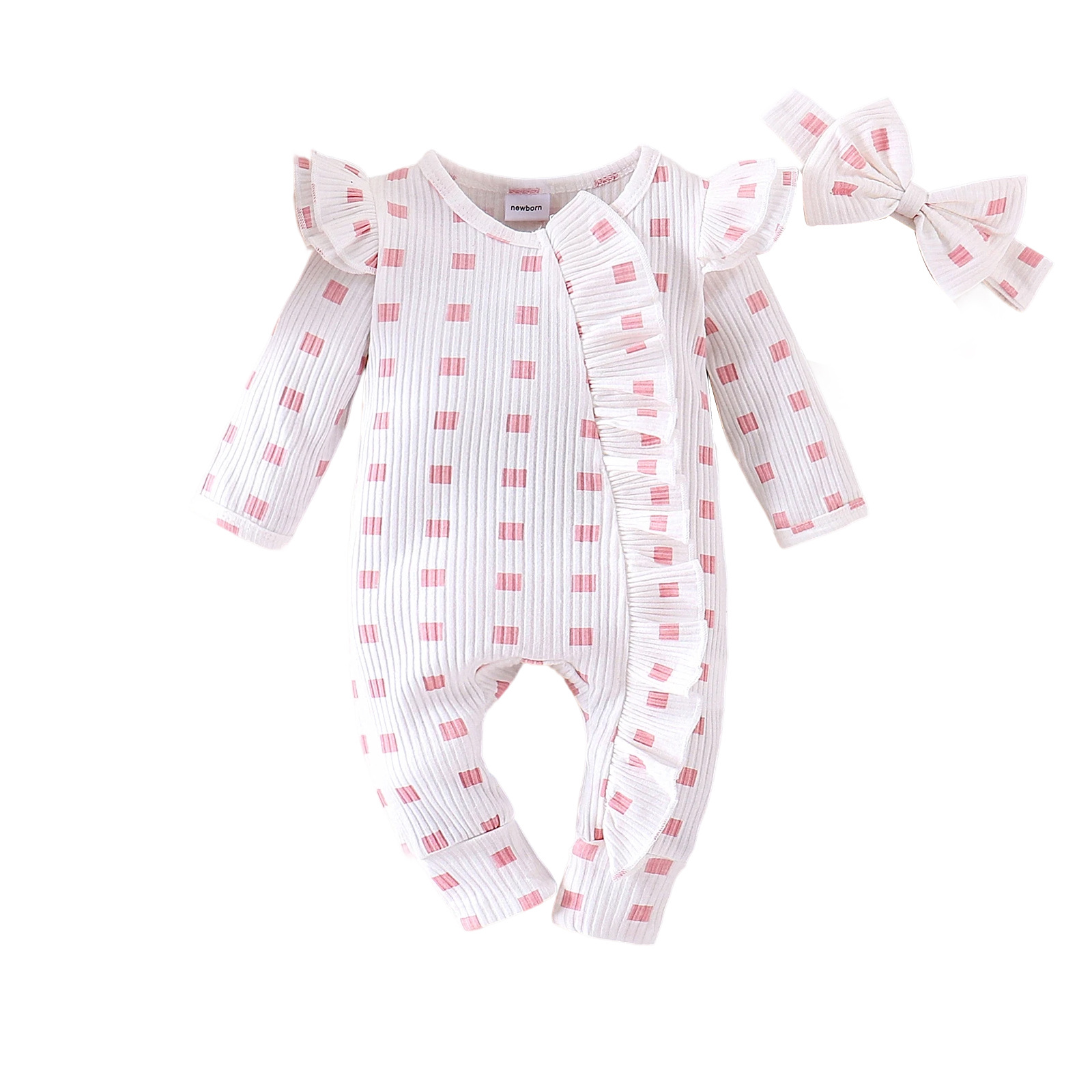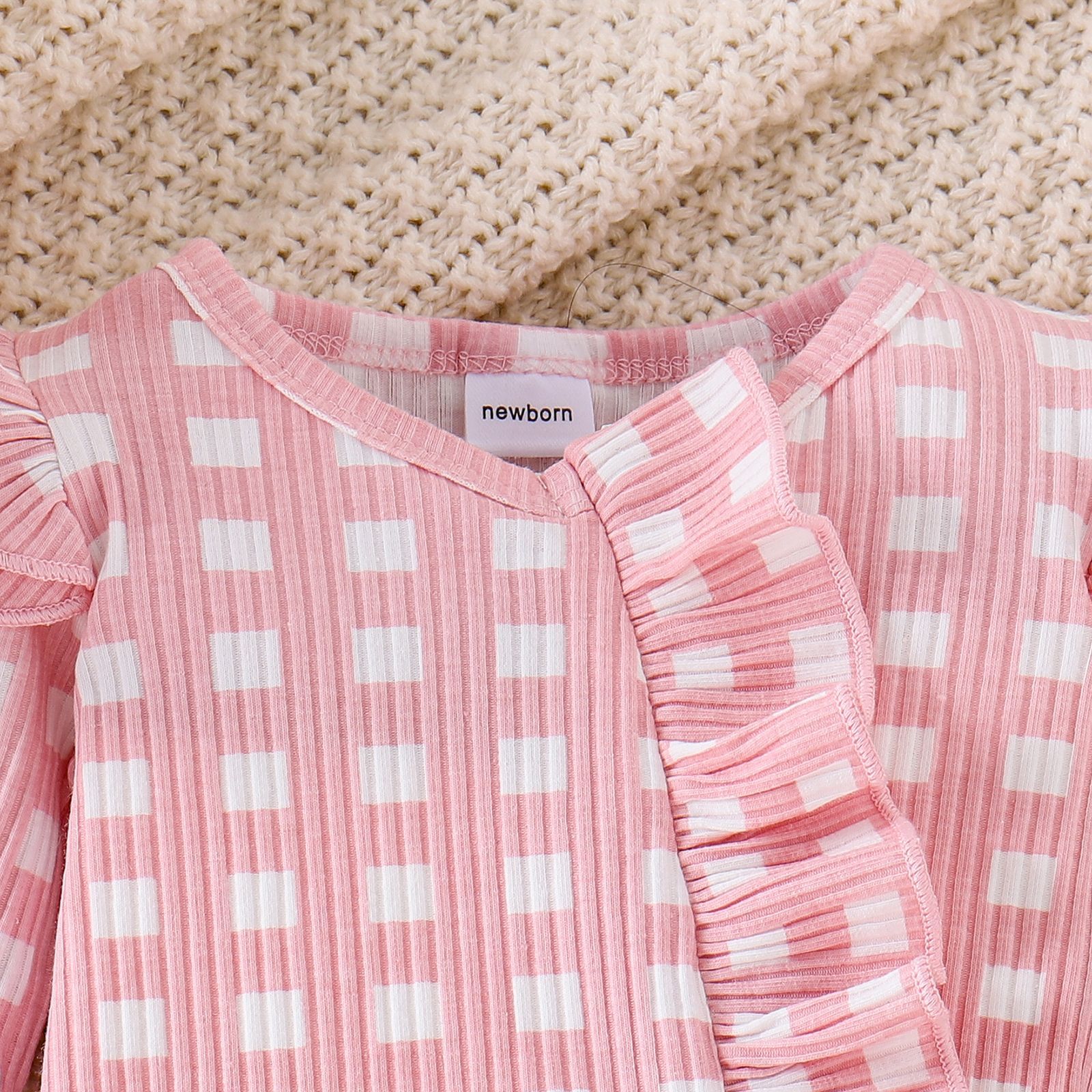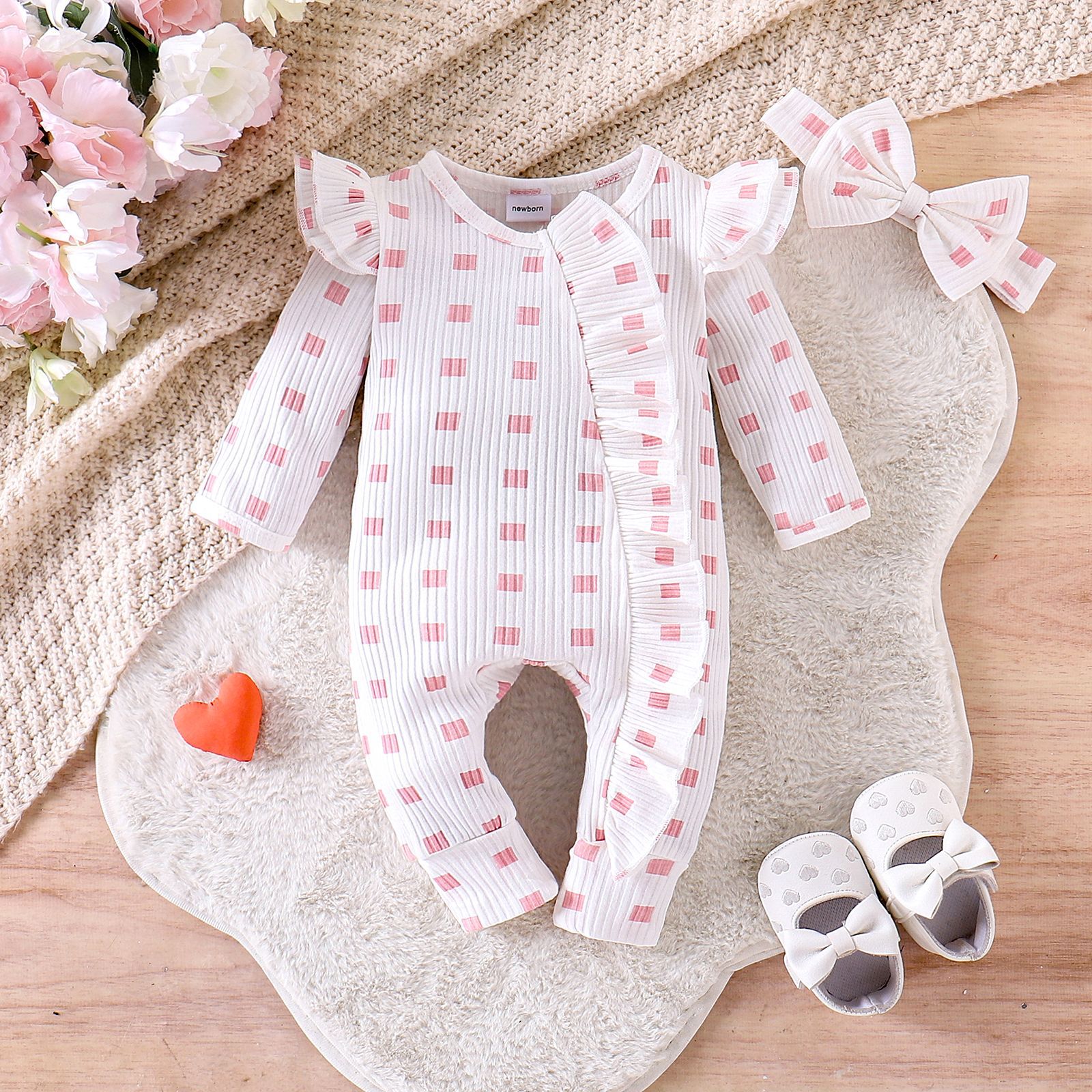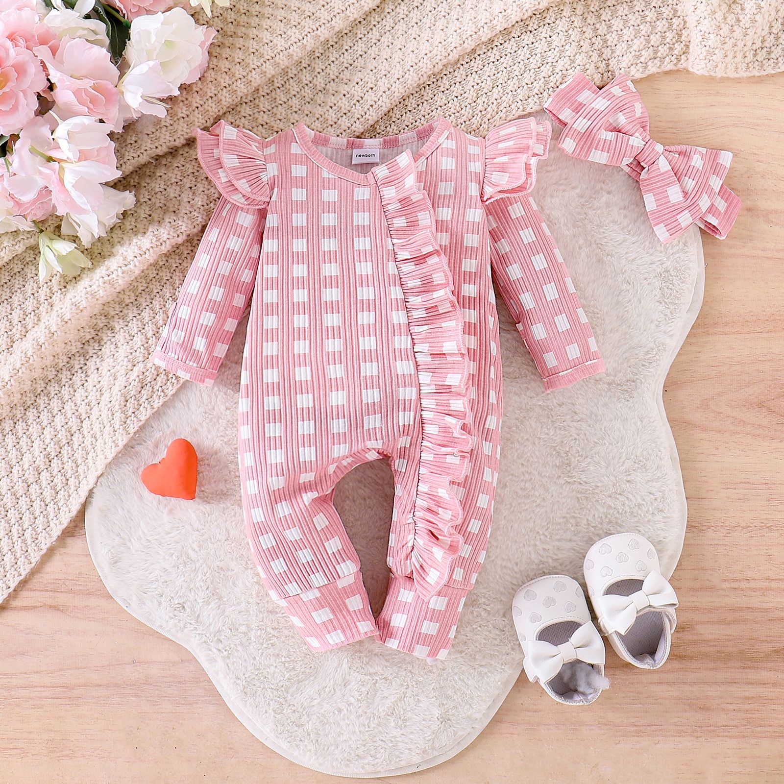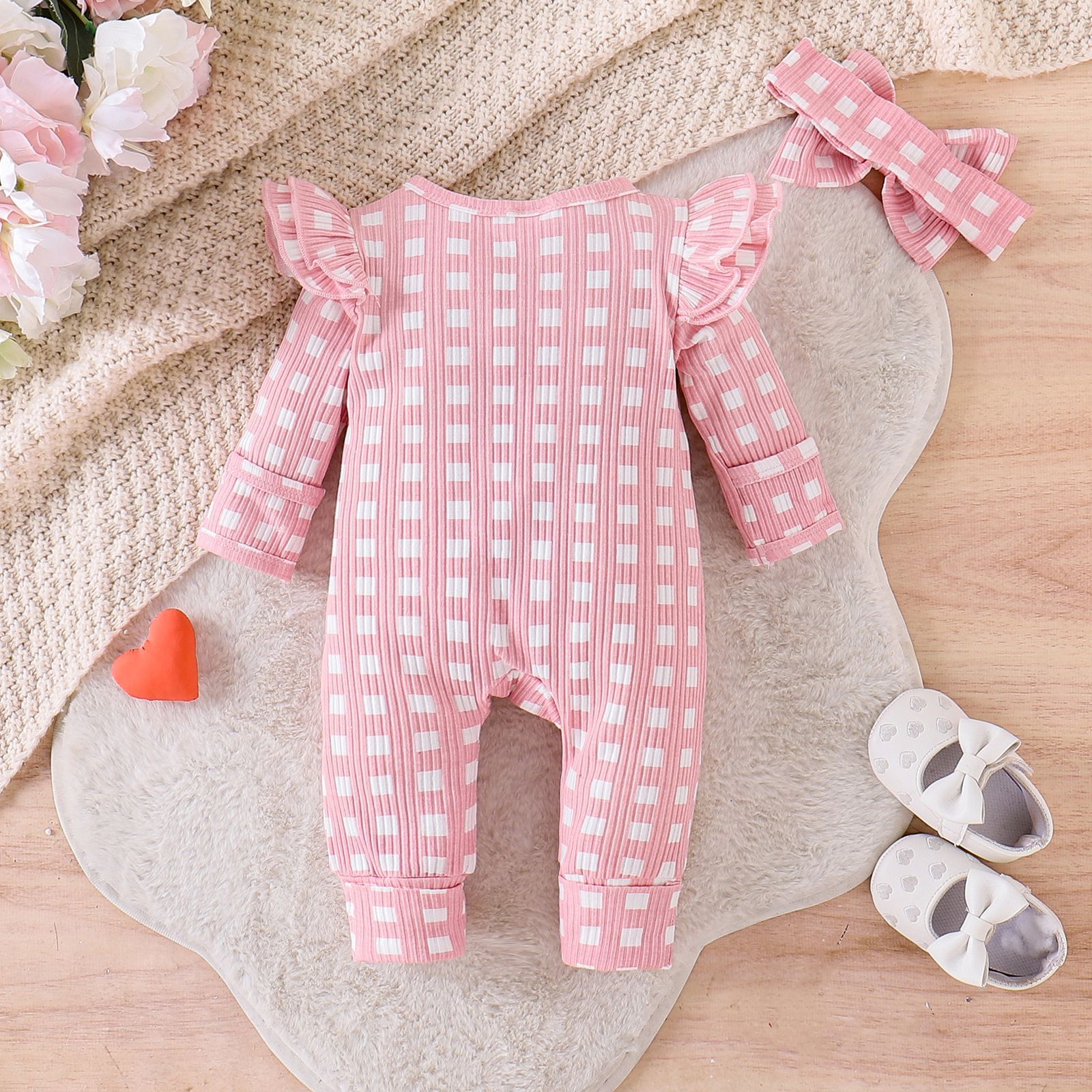 コットン長袖チェック柄ベビーロンパース 春秋快適柔らか肌触り 新生児〜6ヶ月 女の子 欧米風デザイン | Cotton Long-sleeve Plaid Baby Girl Romper Soft Spring Autumn Jumpsuit