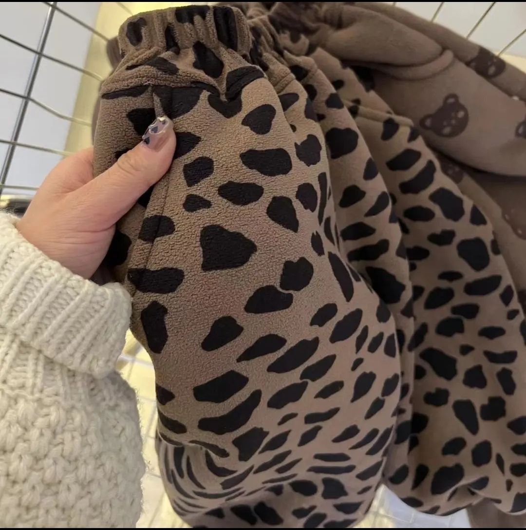 冬のおでかけもぬくぬく快適な子どもサルエルパンツ くま柄&レオパード 裏ボアフリース 80–130cm
