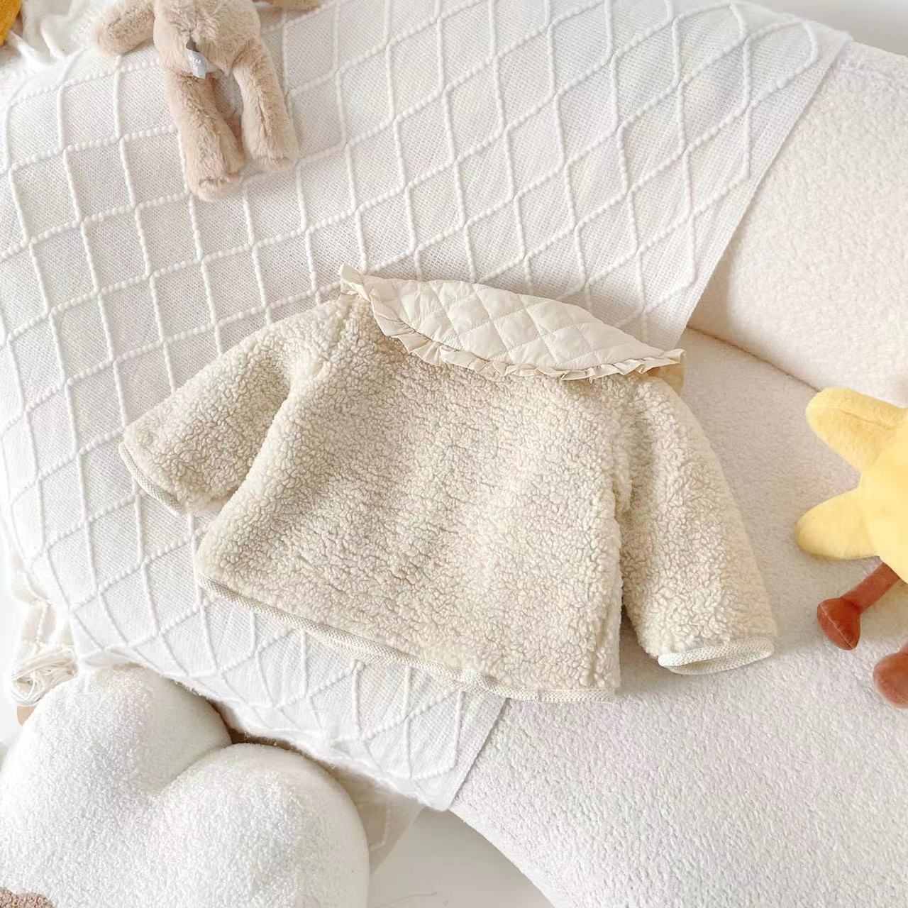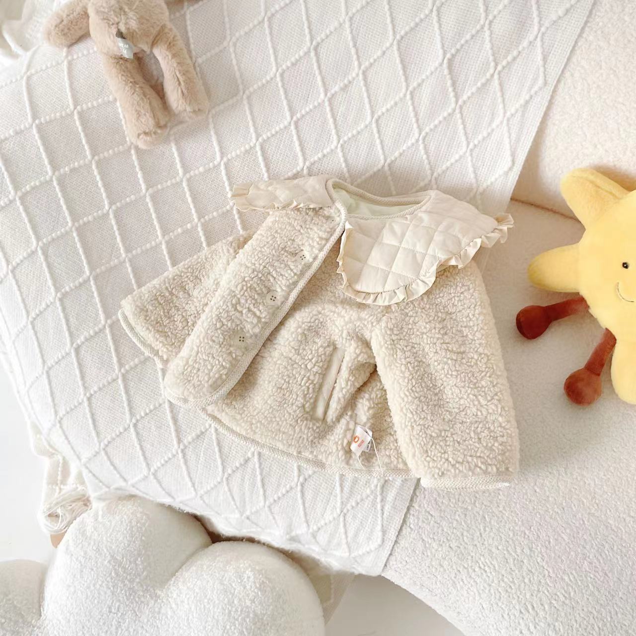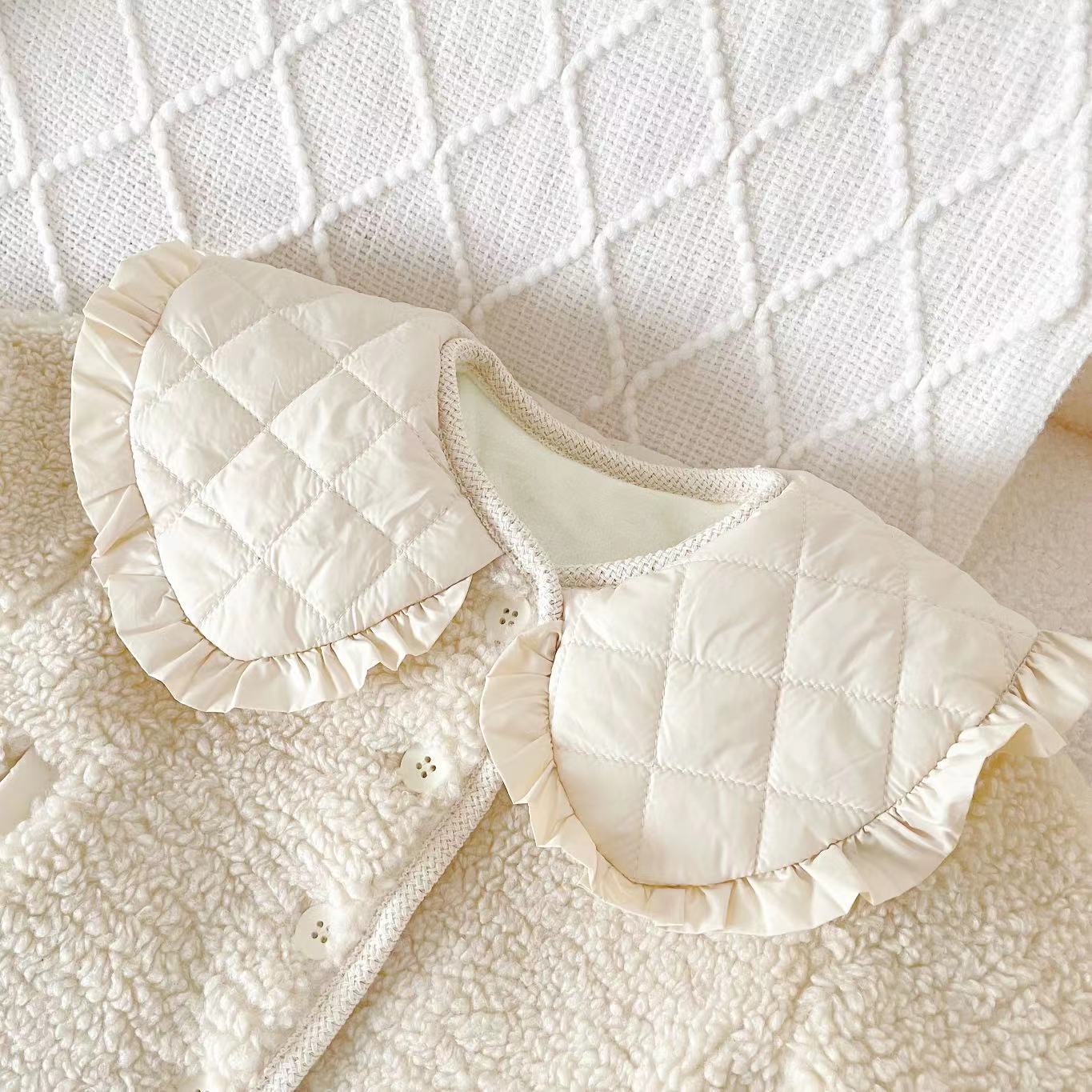 柔らかなコットンライニング が体を包み込み、冷たい風から守ります。 ミルキーホワイトの上品な色合い と フリル襟のデザイン が可愛らしく、特別な日にもぴったりです。