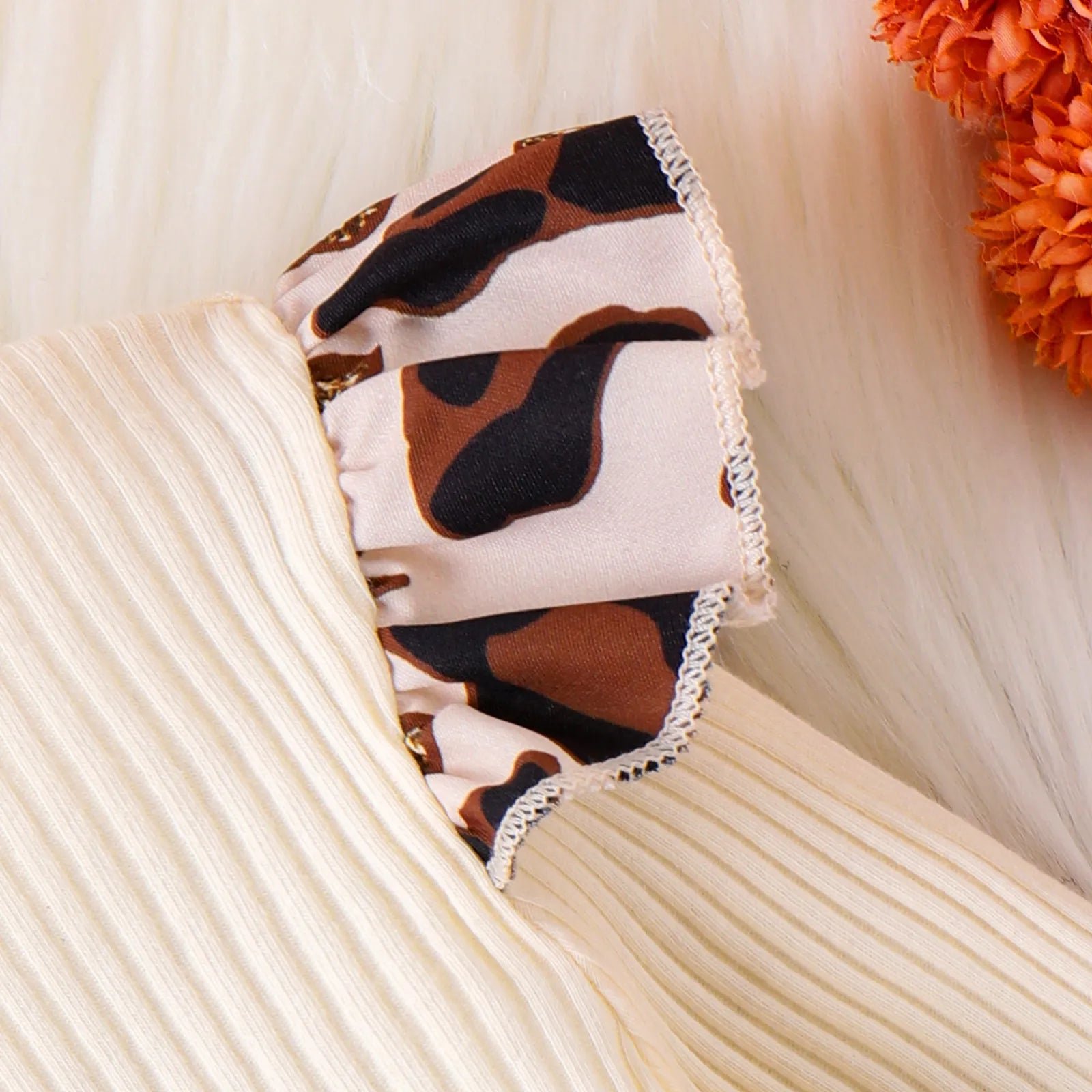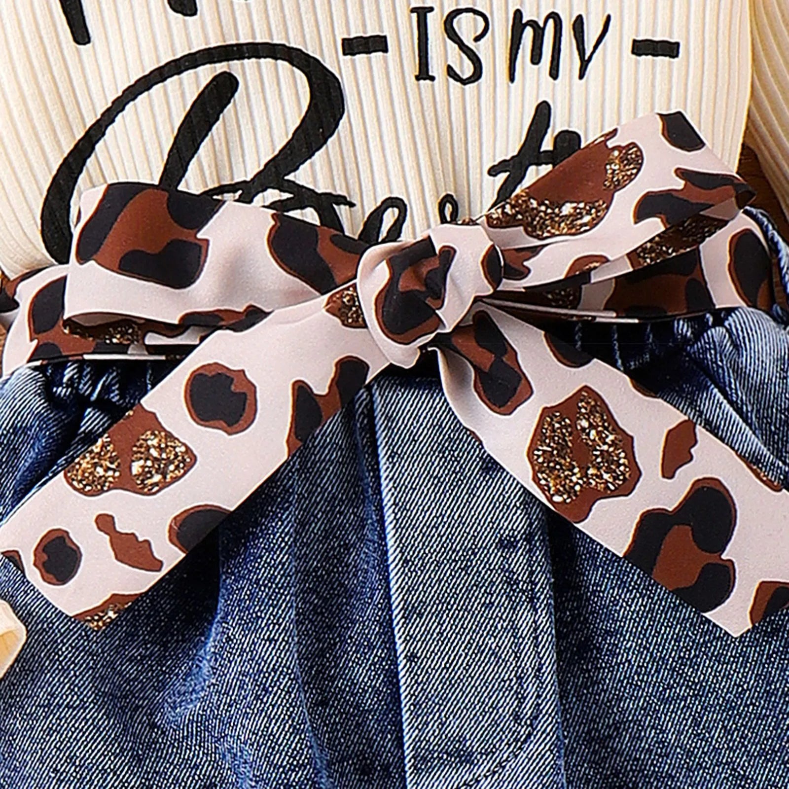 きちんとモードで写真映えする 女の子リブ風長袖トップス&デニムスカート3点セット レオパード柄リボン コットン アプリコット 4〜7歳