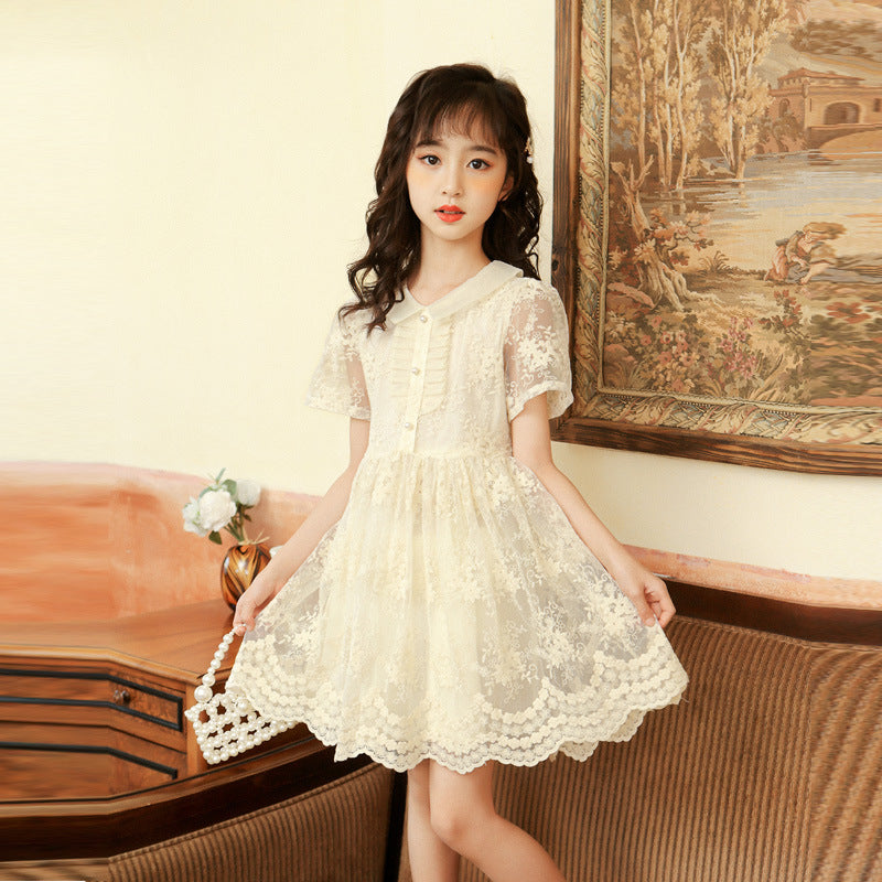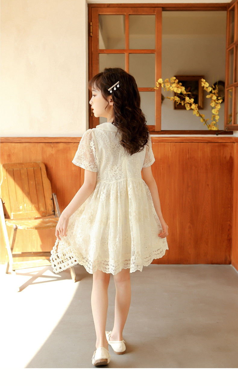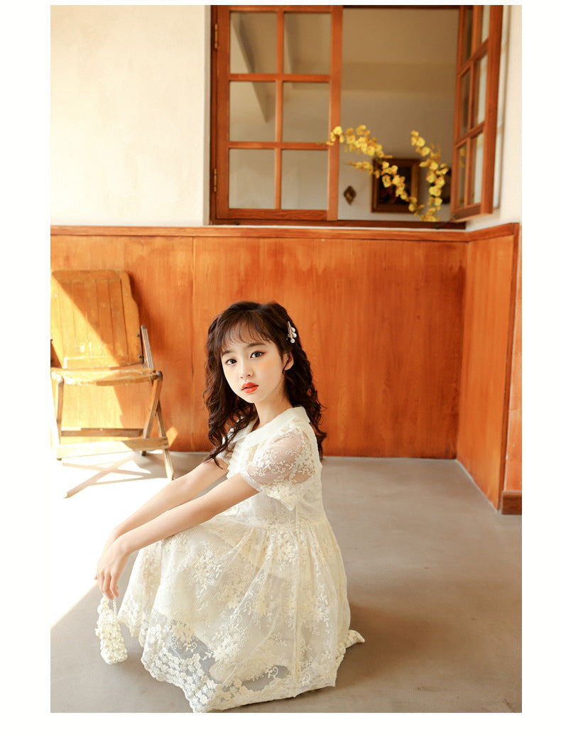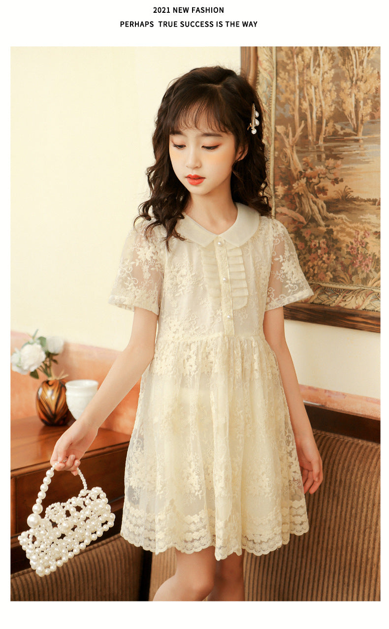 上品レースで夏のおでかけが華やぐ 女の子チュールワンピース ベージュパール 花モチーフレース ナイロン外側 コットン裏地(綿95%) 130~170cm