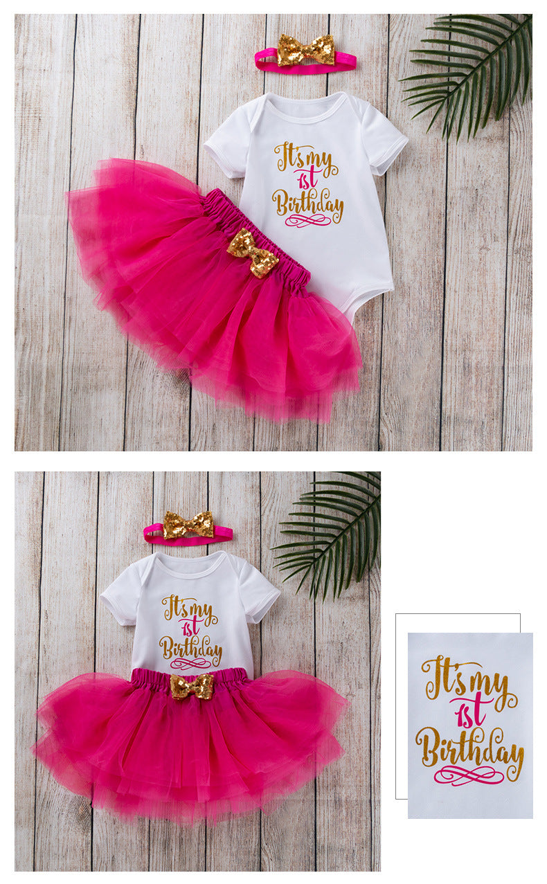 1歳バースデー気分が華やぐ 女の子ロンパース&チュールスカート3点セット レタープリント ローズレッド コットン混素材 59~90cm