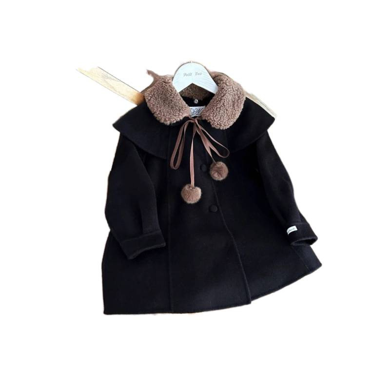 上品クラシックコーデが一枚で完成 女の子ミドル丈コート ポンポンリボン付きウール調ポリエステル 100–150cm