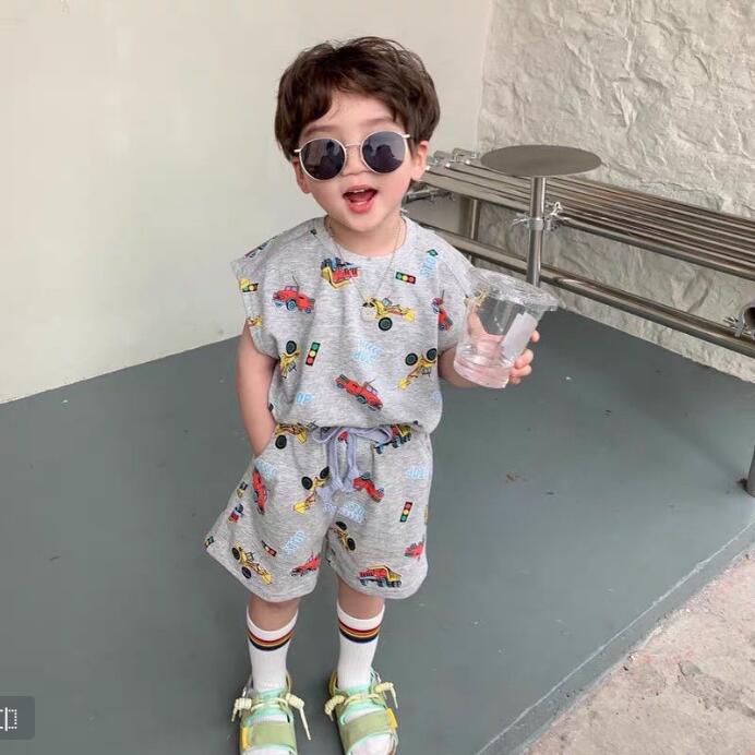 さらりと軽い カー柄プリント半袖Tシャツ&ショーツ上下セット(80〜130cm)