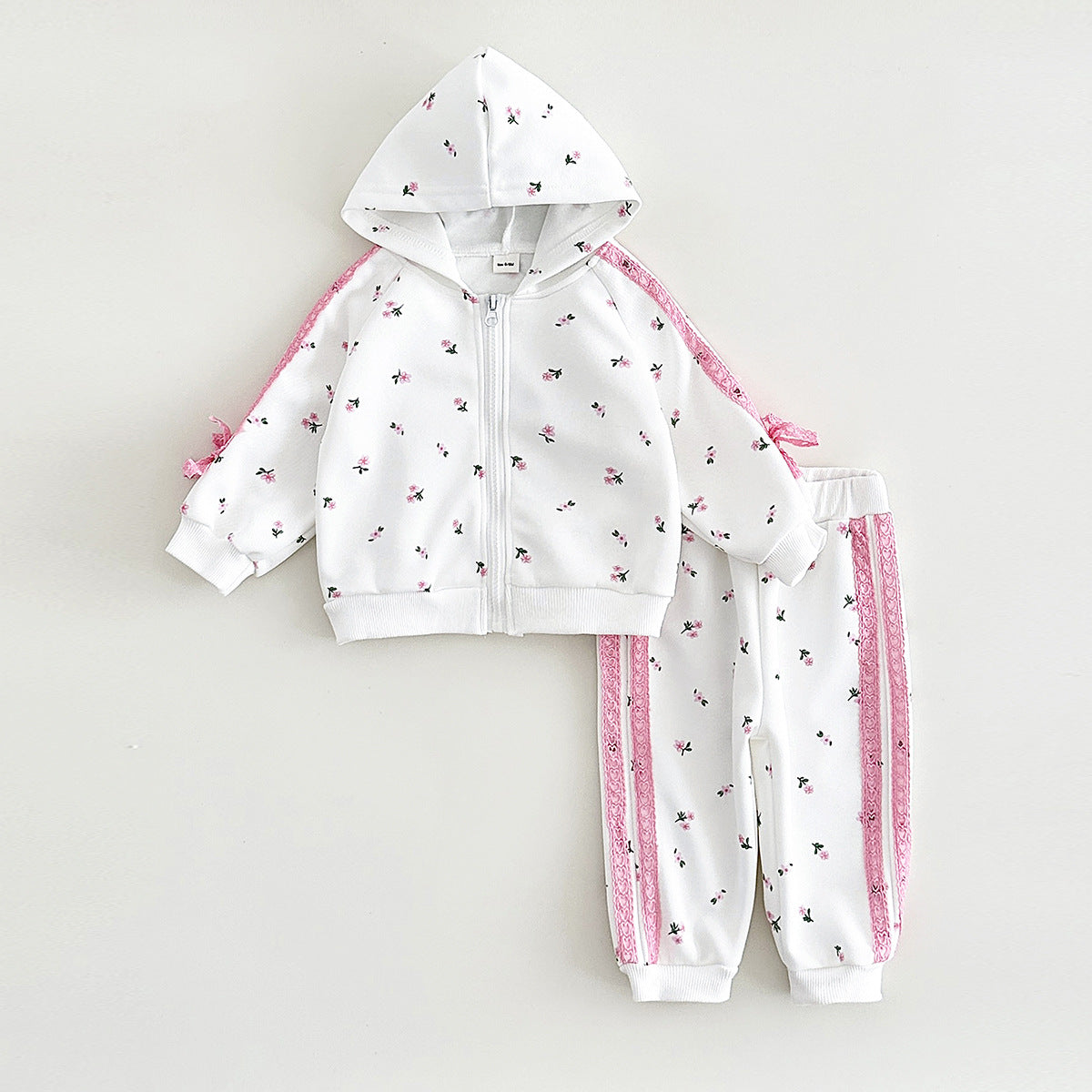 やさしいぬくもりでおでかけが楽しくなる 女の子フード付きジップアップジャケット&ロングパンツセット 小花柄×レースライン コットン素材 6ヶ月〜3歳