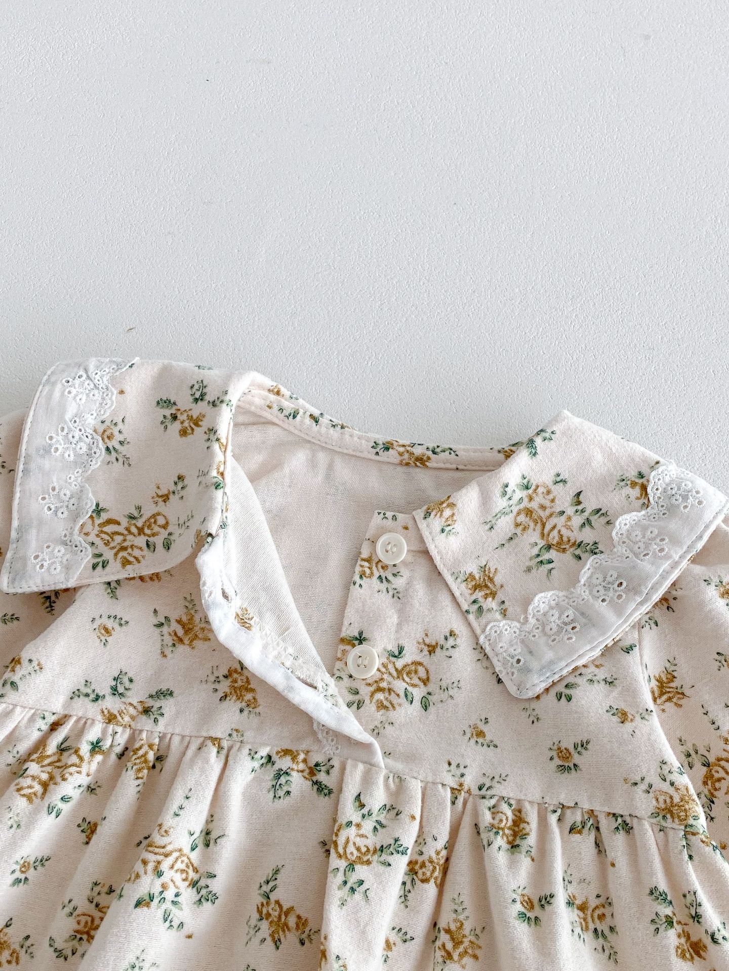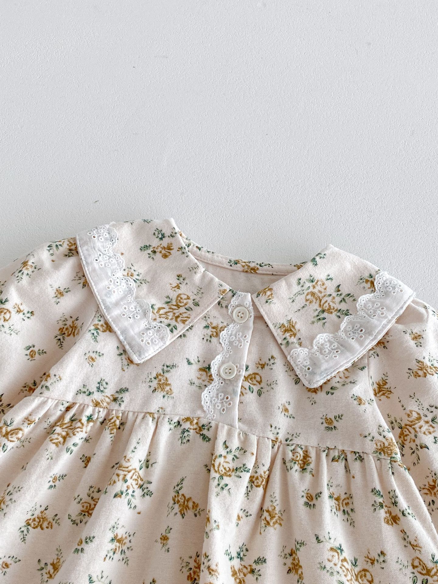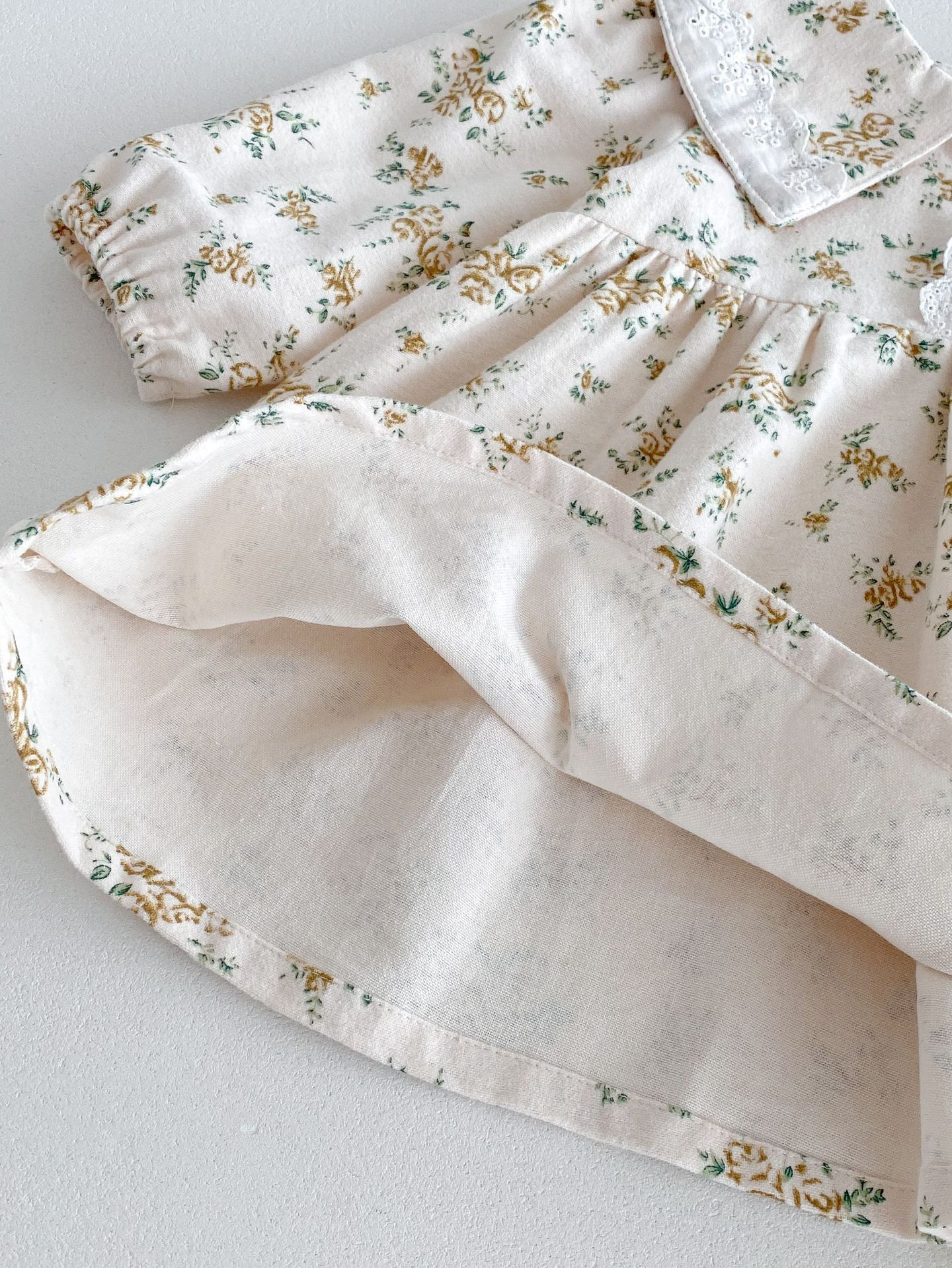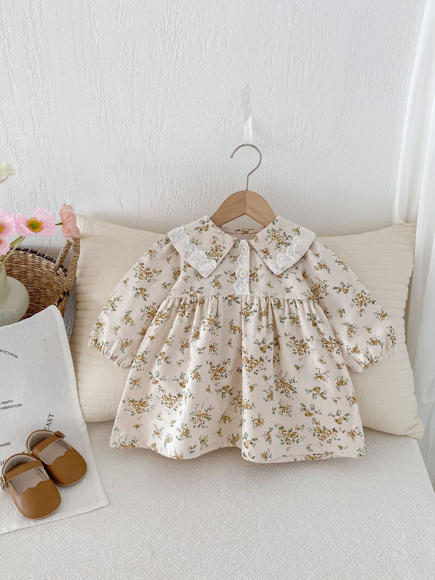 上品で愛らしい 花柄プリンセスドレス 。やわらかな 綿100%素材 を使用し、肌にやさしく通気性も抜群。繊細な花柄のスカート部分とクラシックな襟デザインが、女の子らしいエレガントな雰囲気を引き立てます。