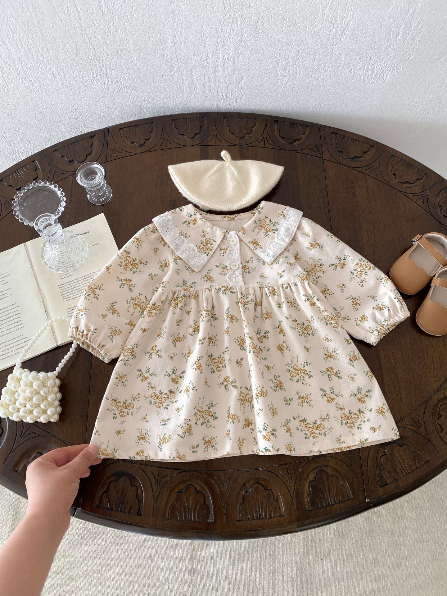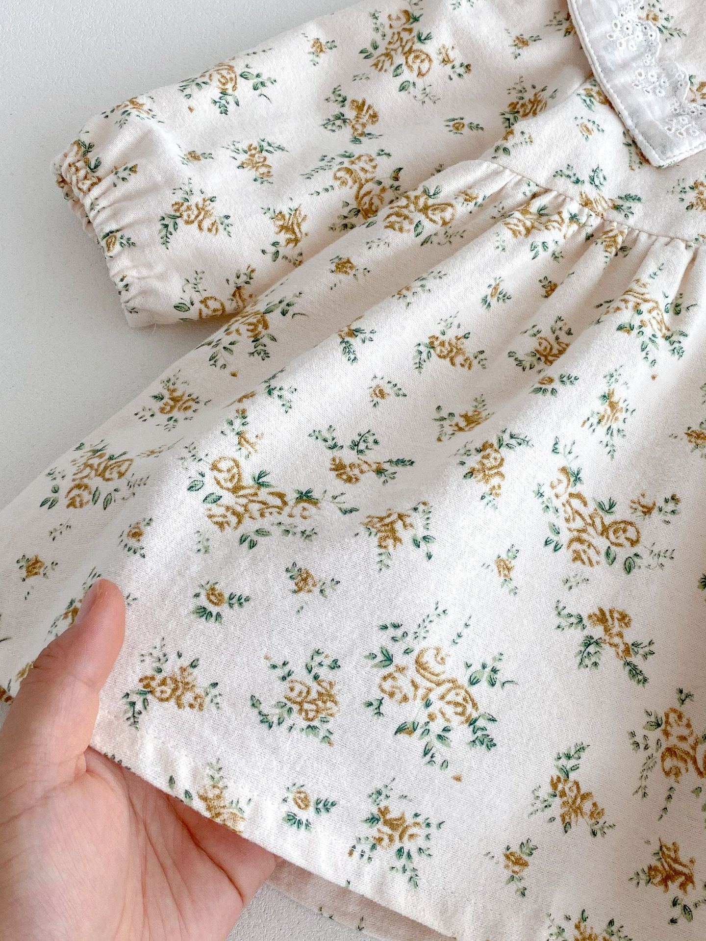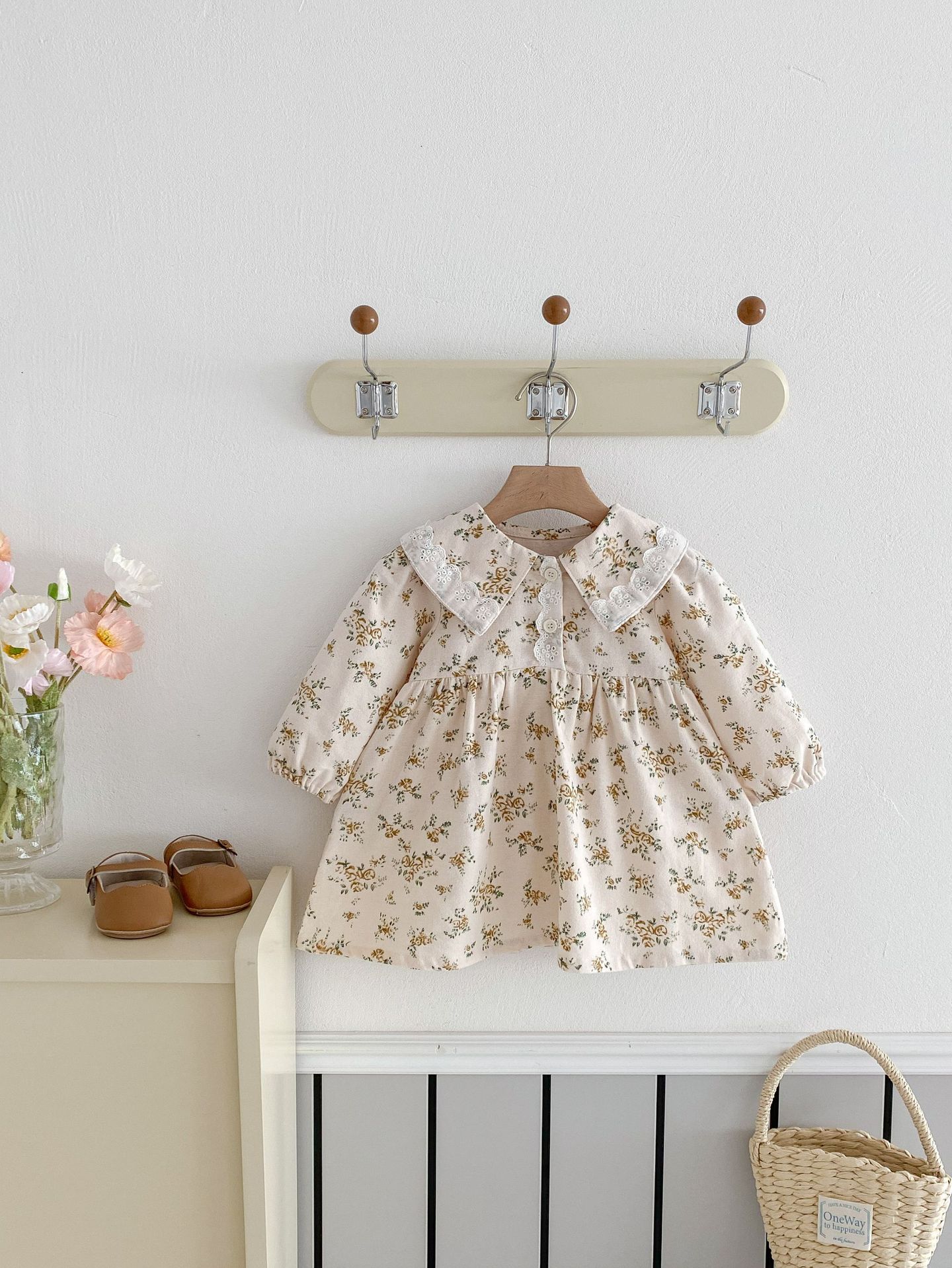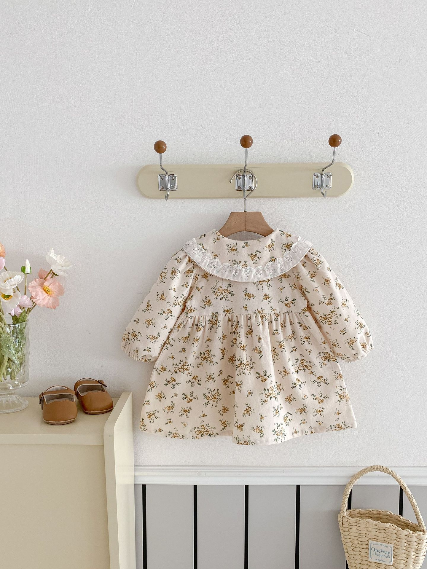 上品で愛らしい 花柄プリンセスドレス 。やわらかな 綿100%素材 を使用し、肌にやさしく通気性も抜群。繊細な花柄のスカート部分とクラシックな襟デザインが、女の子らしいエレガントな雰囲気を引き立てます。