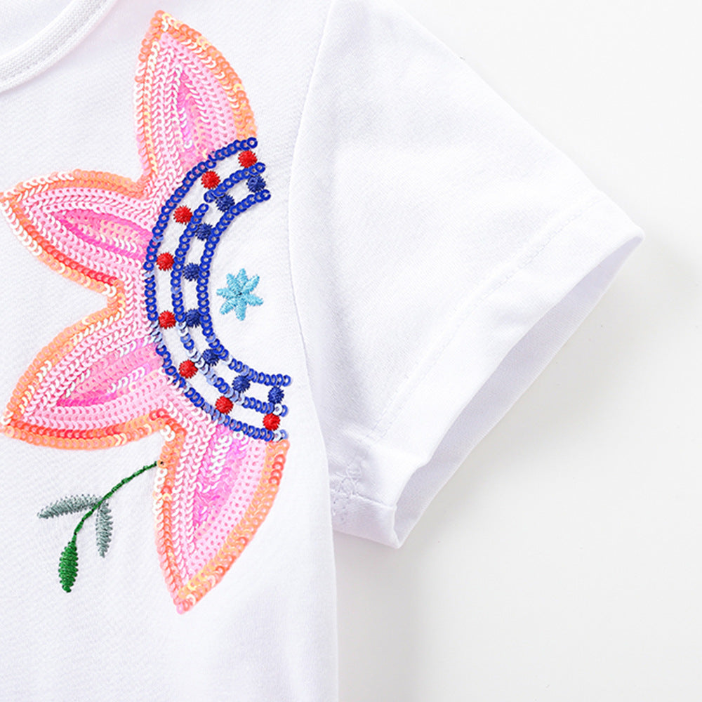 ふんわりチュールでプリンセス気分が高まる 女の子半袖ワンピース 花柄スパンコール ピンク コットン素材 90~140cm