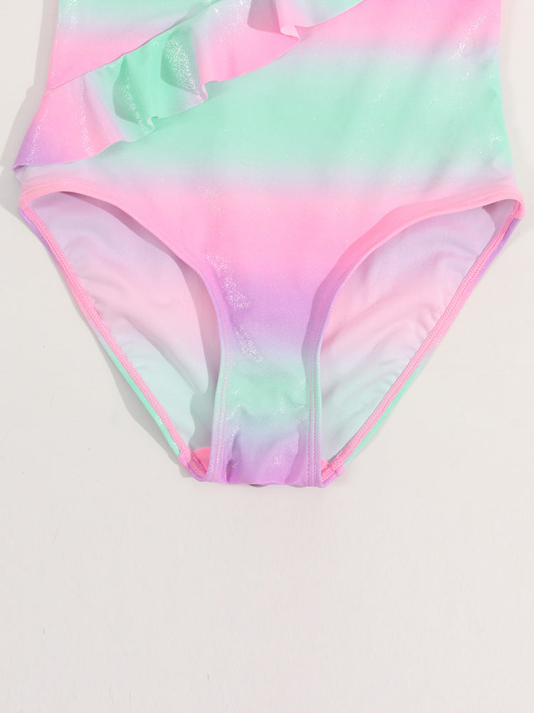 グラデーションラメ調 ガールズワンピース水着|アシンメトリーフリル・ナイロン82%・70〜100cmcm