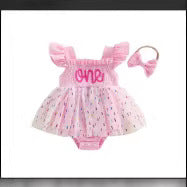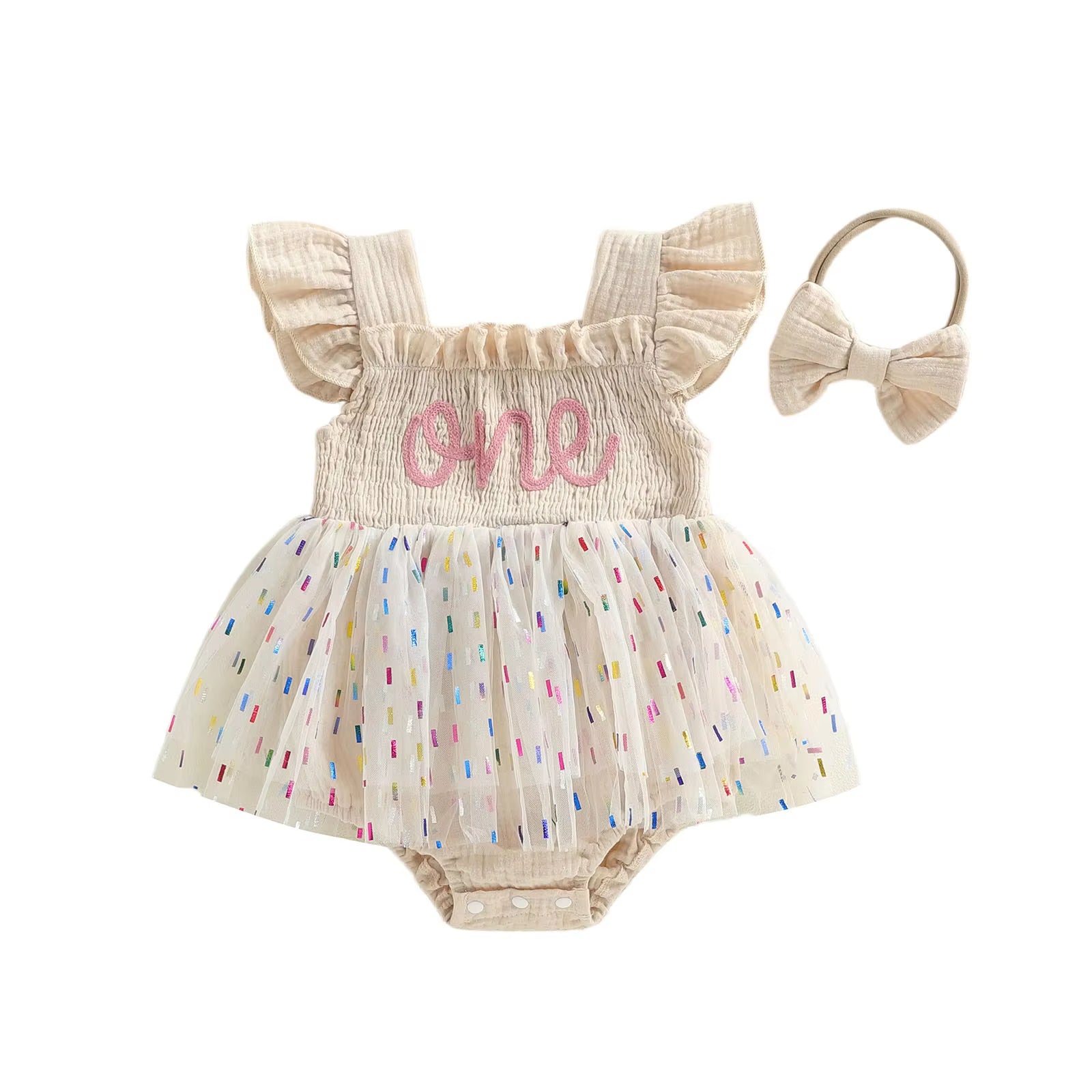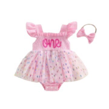 ふんわりチュールで写真映えする 女の子ベビーメッシュロンパース one刺しゅう ボウヘアバンド付き コットン 6〜18ヶ月