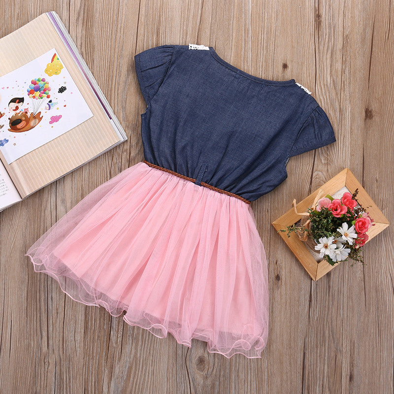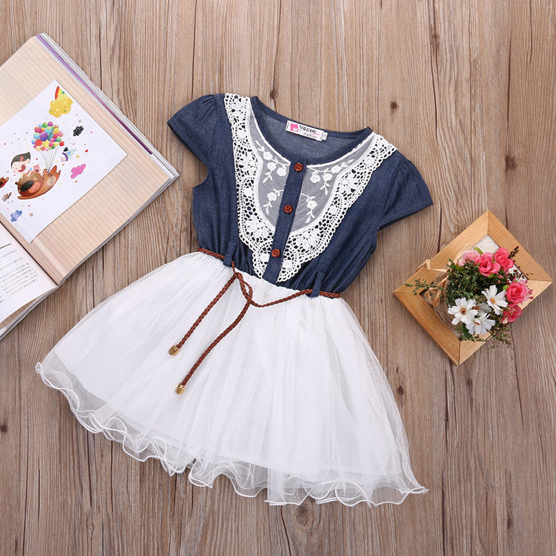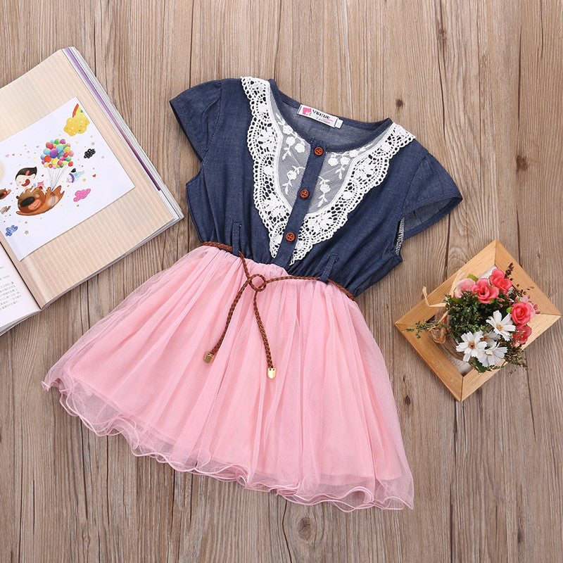 レース襟で上品にときめく 女の子半袖ワンピース デニム切替チュールスカート コットン95% 90~130cm