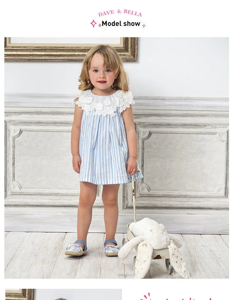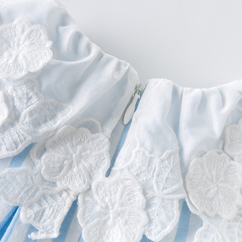 清楚ストライプで写真映えする 女の子ノースリーブワンピース ブルー×ホワイト縞柄 立体襟デザイン コットン100% 66~130cm